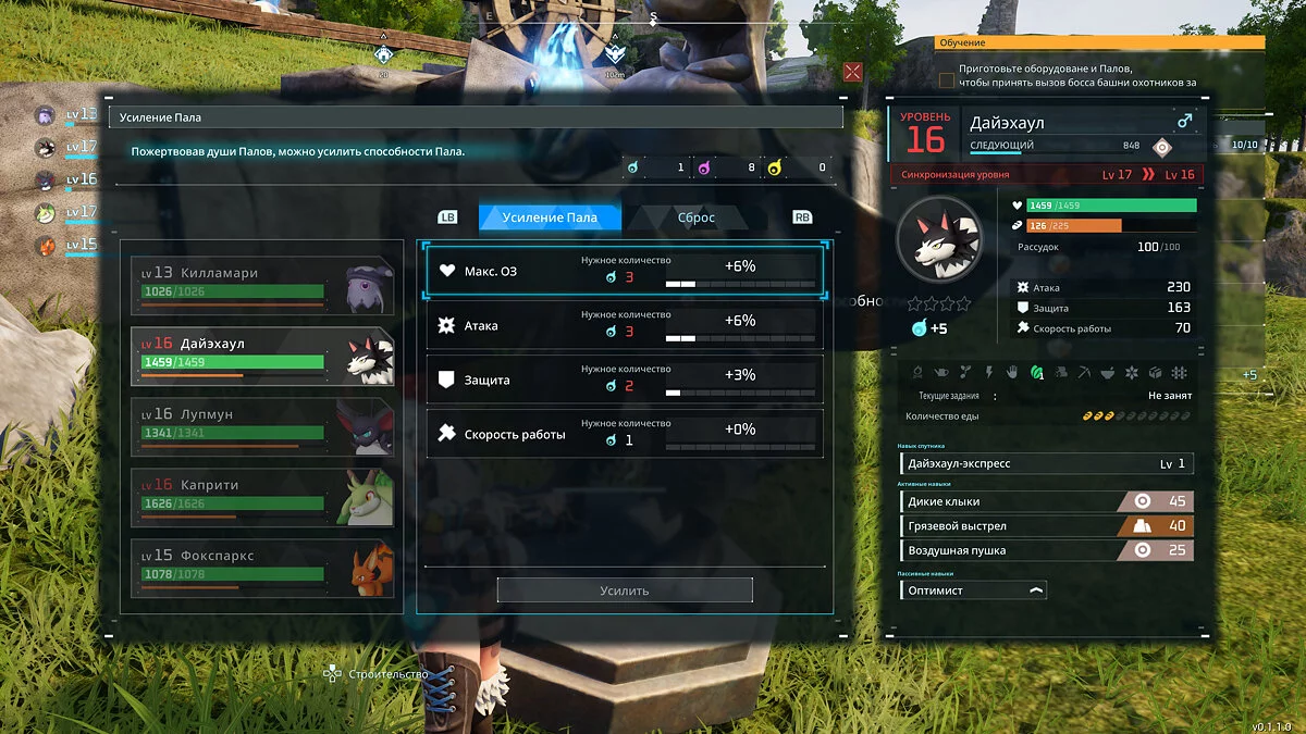 Все Палы качаются самостоятельно, даже когда выполняют работу на базе. Однако максимальный уровень для них — уровень игрока. У каждого существа есть характеристики: атака, защита, скорость работы и максимальное здоровье. в открытом мире вы сможете найти монументы силы. С их помощью улучшается ваша способность ловить Палов, а также характеристики существ.