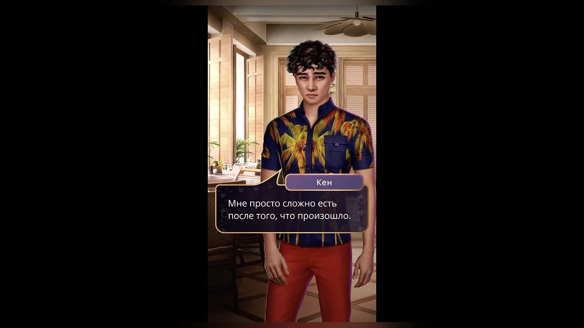 Обед подан в ресторане при отеле. Девушка сидит вместе с Брэдли и Кеном. Кен ковыряет вилкой свой салат «Нисуаз» и выглядит так, будто хочет что-то сказать.