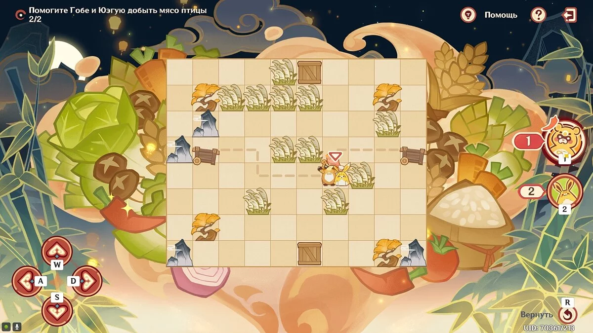 Снова толкайте ящик по центру в самый низ и встаньте на клетку с ингредиентом. Гобу тоже не забудьте туда поставить.