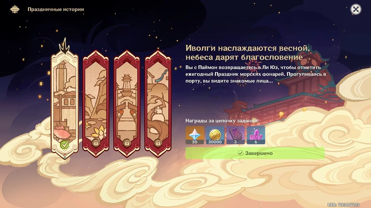 Когда получите новую информацию, пообщайтесь с Чжень Юань в лавке, где продают воздушных змеев. Останется лишь поболтать с Ка Мин для открытия испытаний, однако на этом история не закончится. Вы сможете продолжить прохождение, если перейдёте на вкладку «Праздничные истории» для завершения квеста.