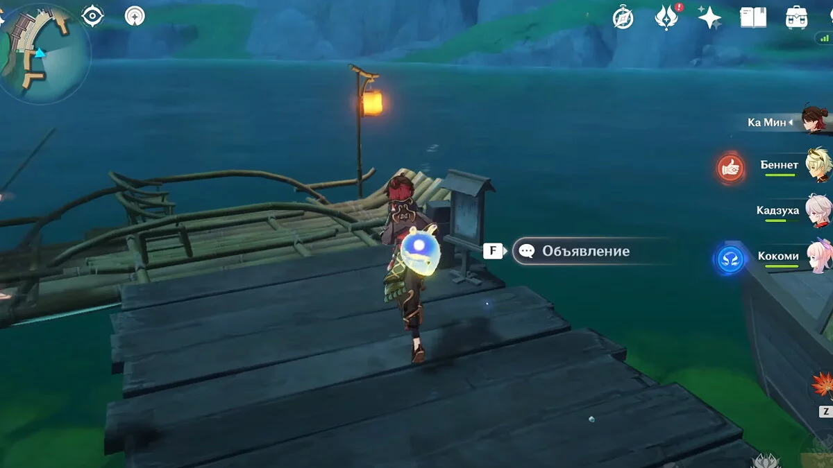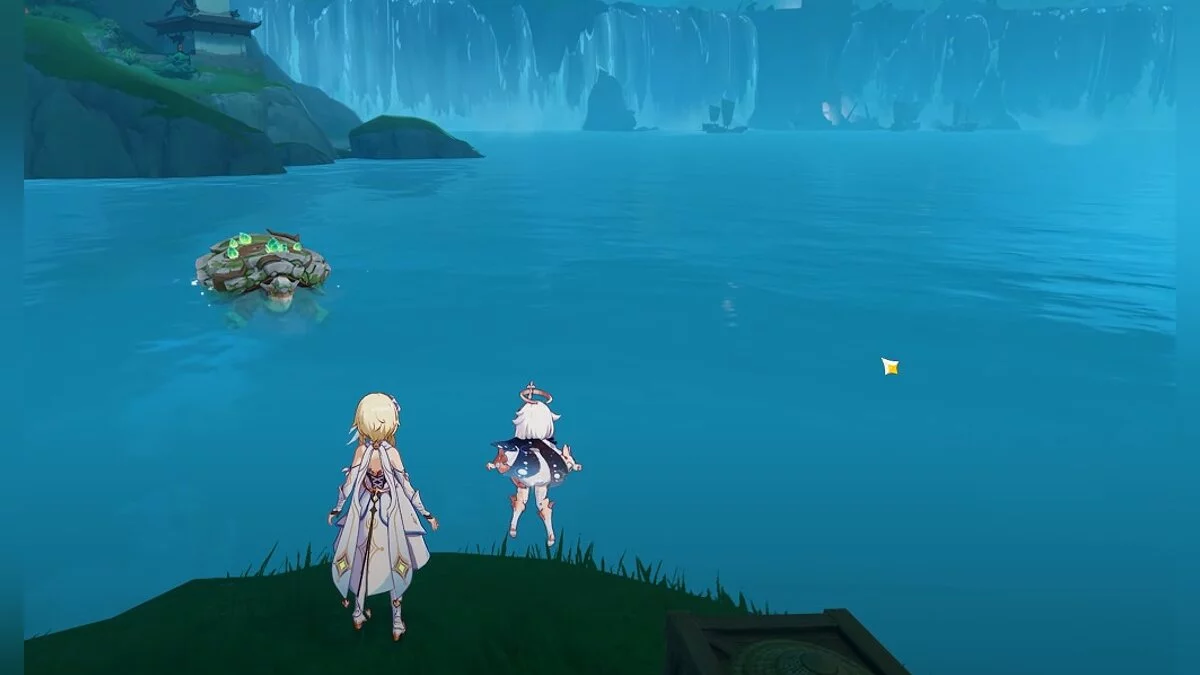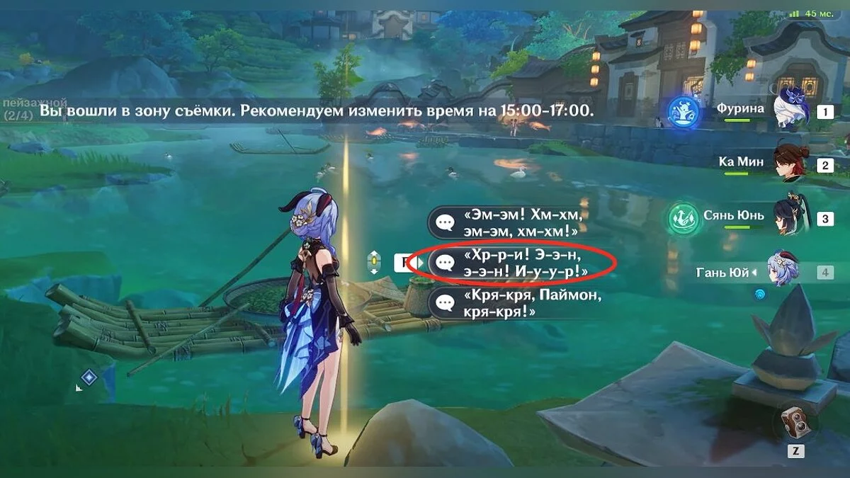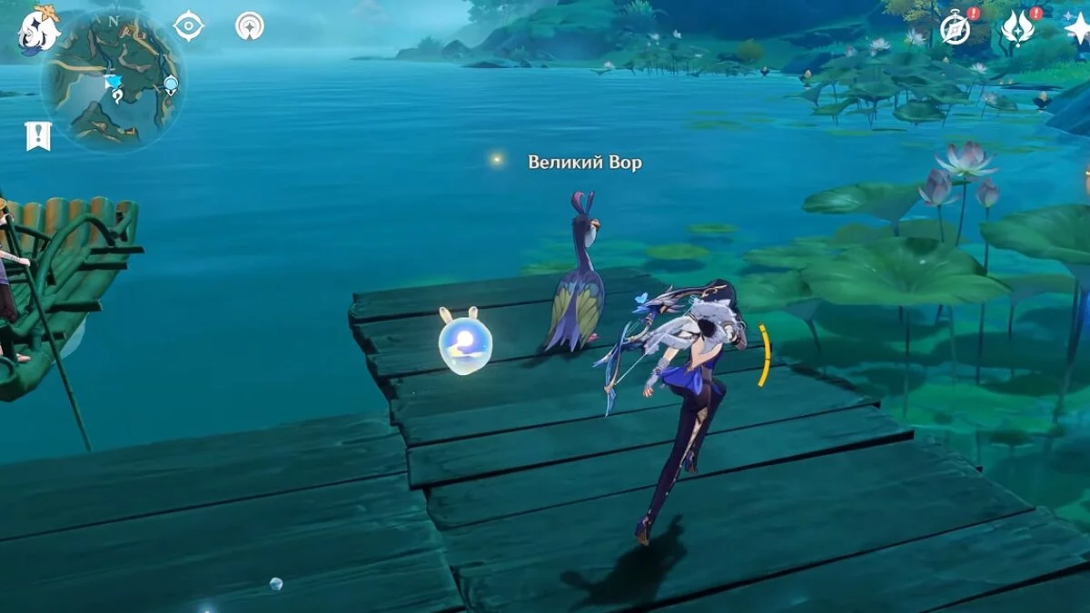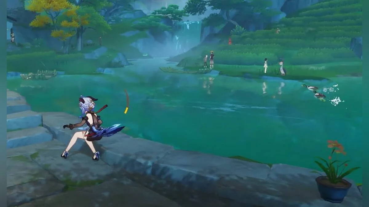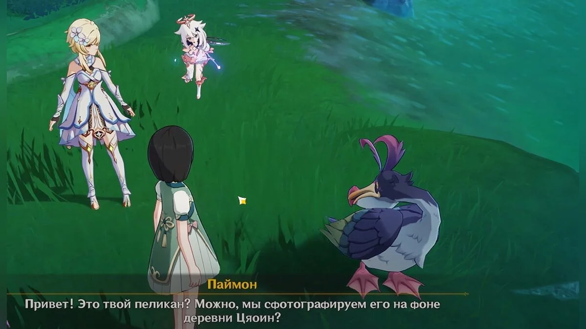 Встаньте на каменный мостик. Паймон должна произнести монолог про пеликанов.