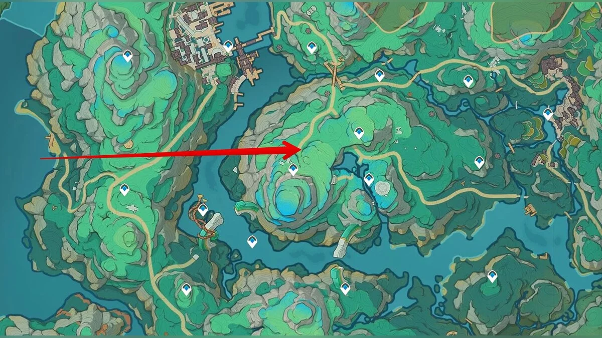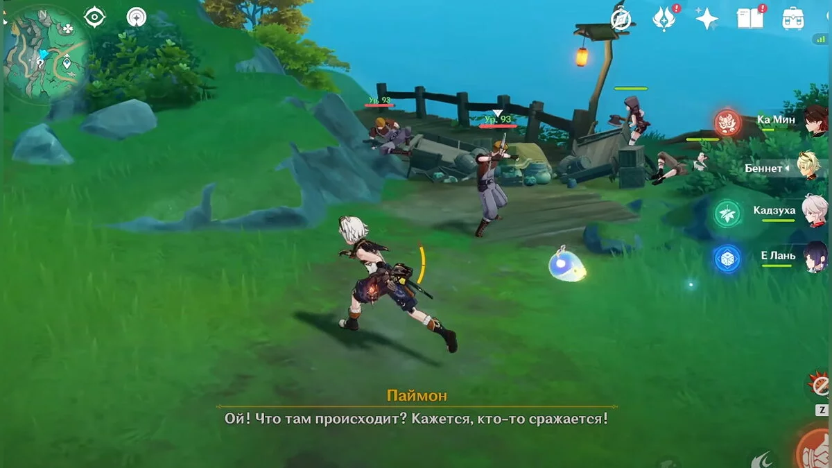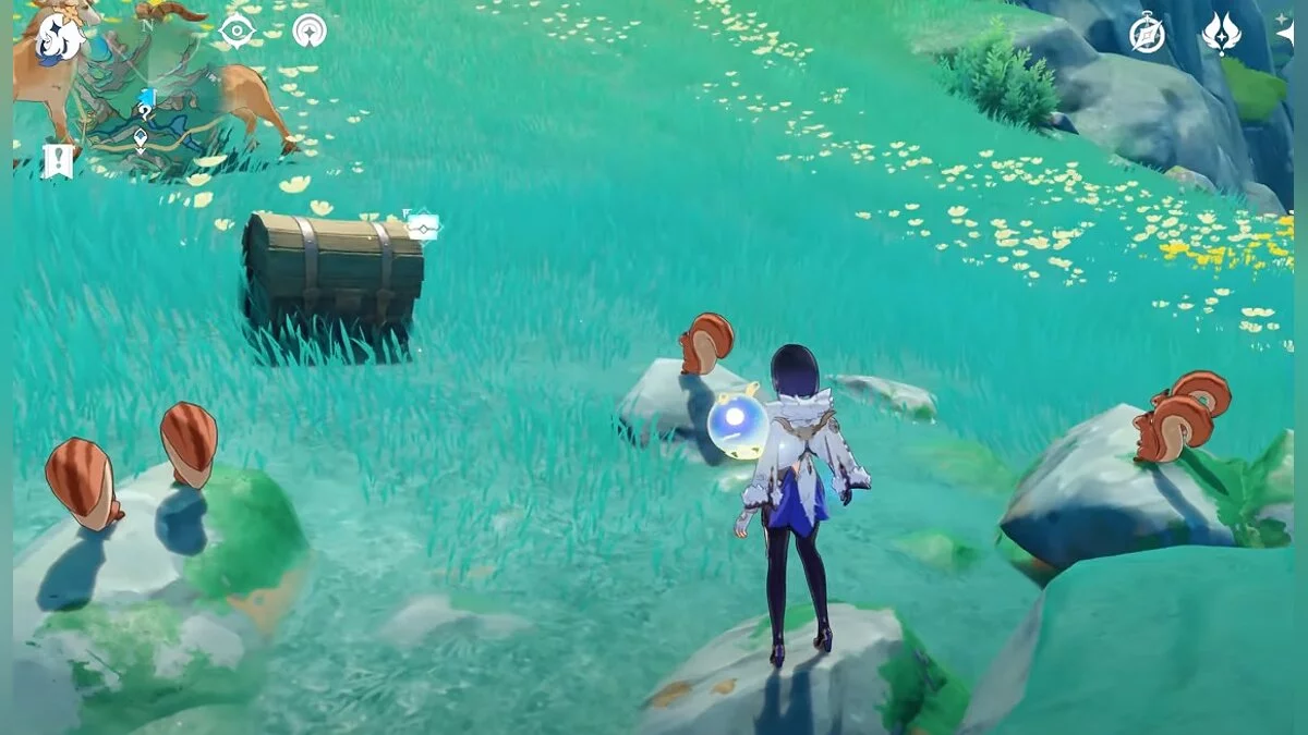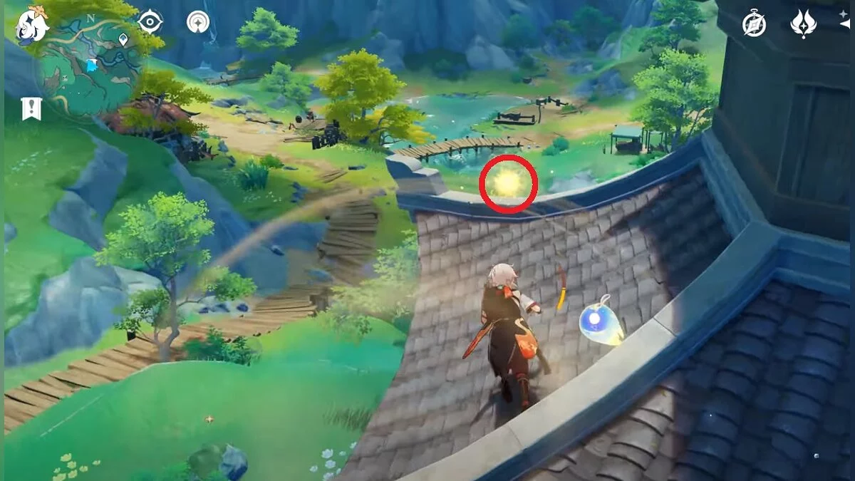 Далее вам нужно бежать на северо-запад. Следующий отряд хиличурлов ждёт вас возле деревянных домиков. Там же находится богатый сундук.