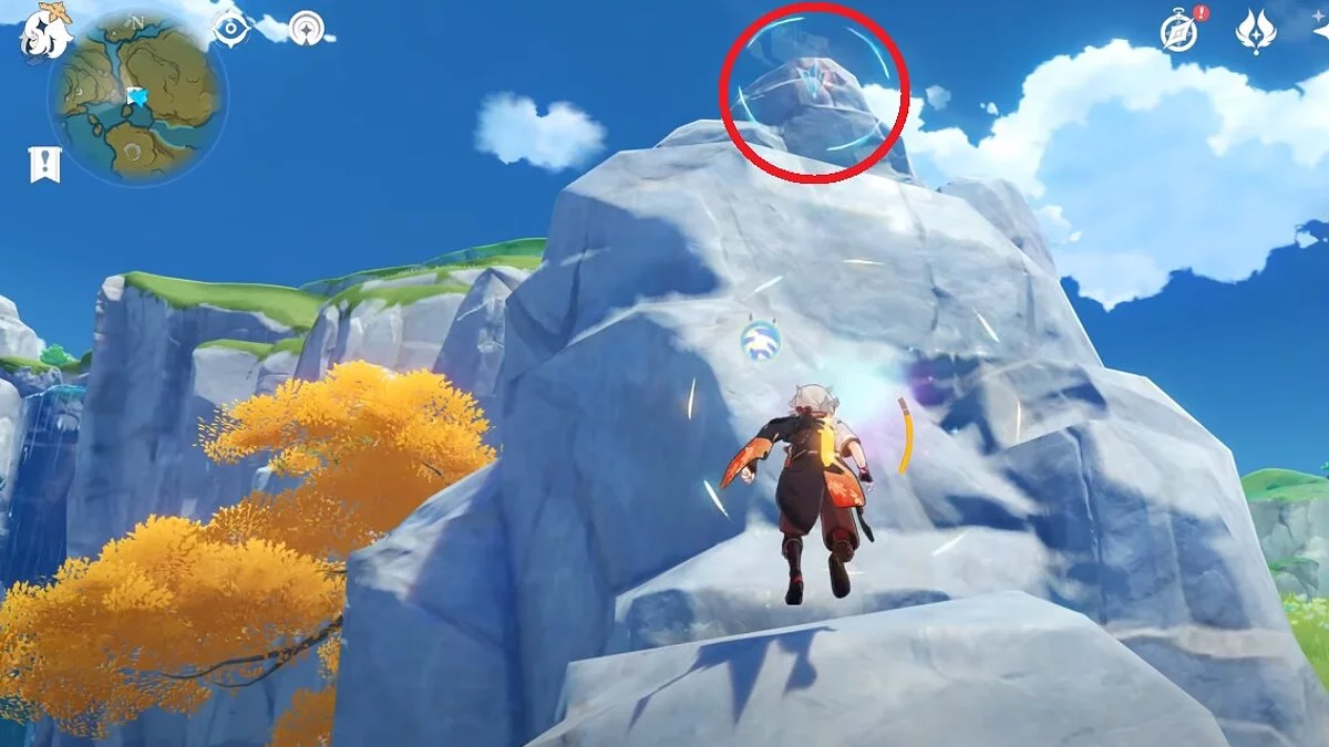 Заберитесь на вершину скалы. Можете воспользоваться золотым карпом.