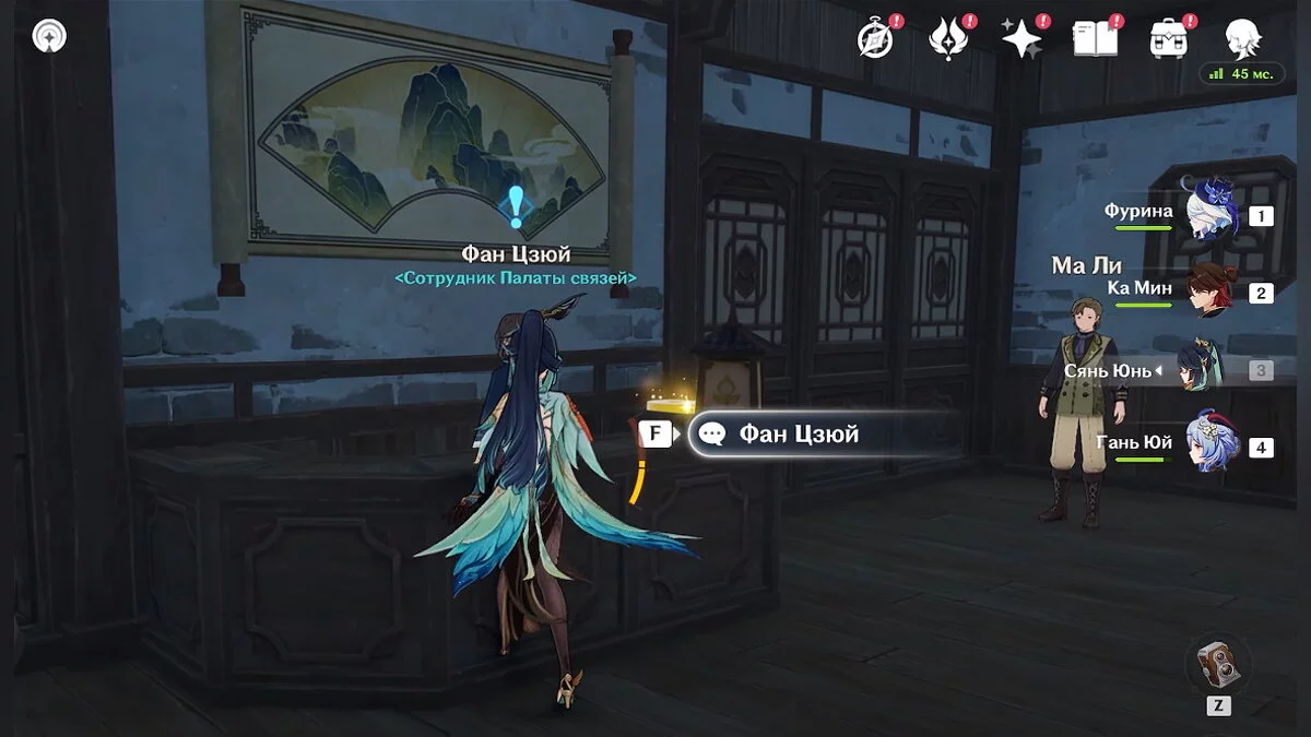Поговорите с Фан Цзюй. Она находится на верхнем этаже здания, которое находится рядом с телепортом. Ориентируйтесь по значку квеста на мини-карте.