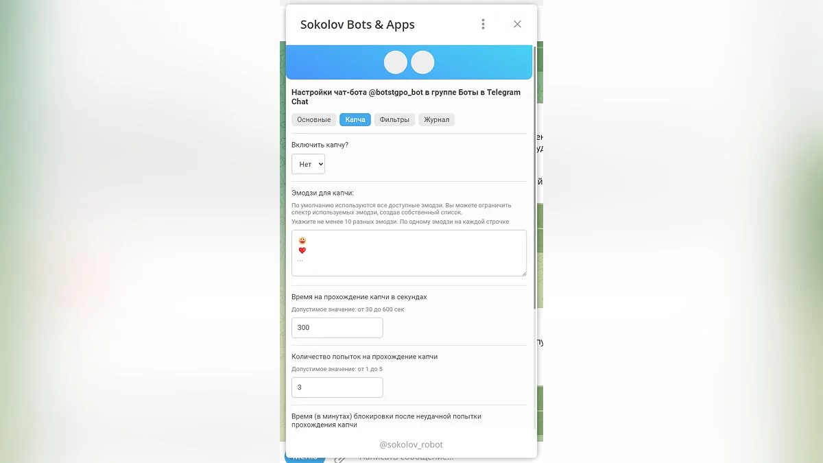 Как настроить чат-бота. Как включить капчу, фильтры и журнал
