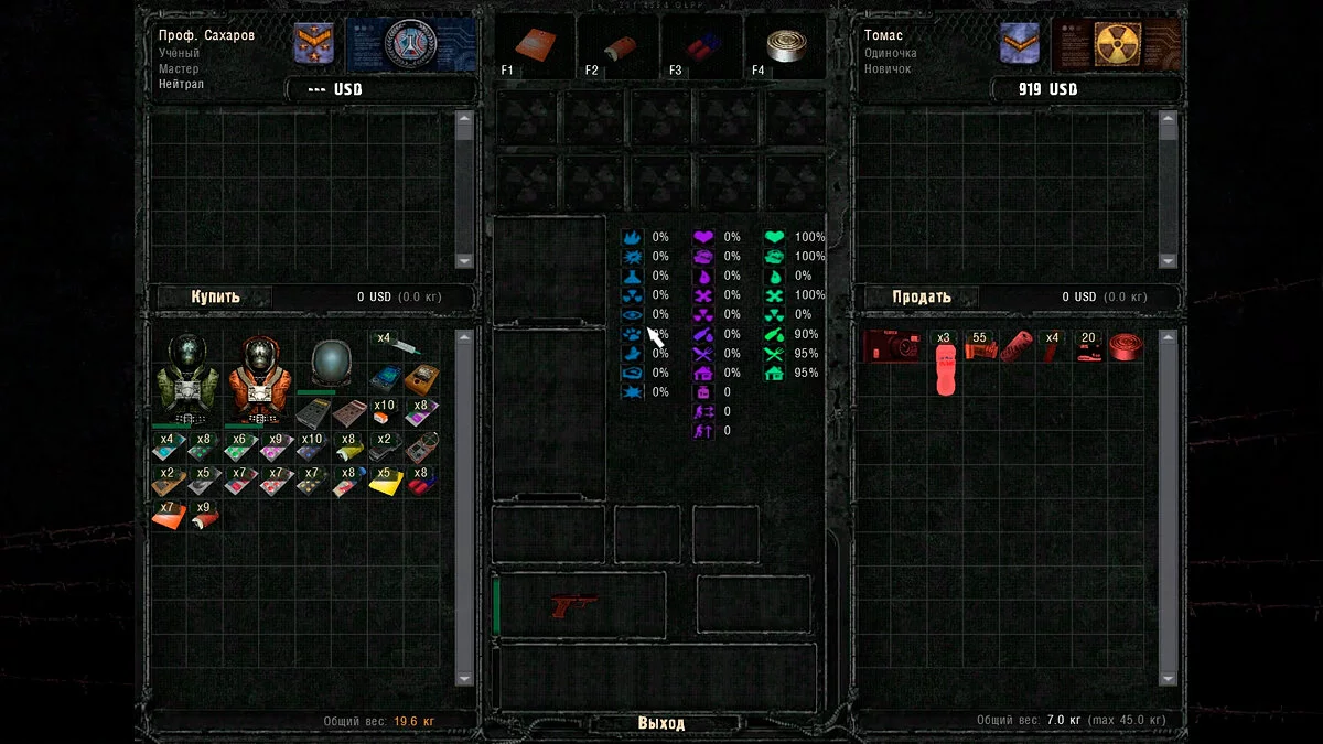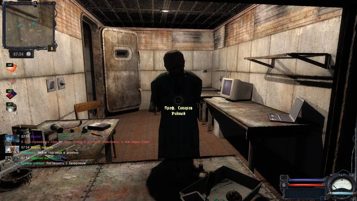 У самого учёного можно приобрести различные медикаменты, детекторы аномалий и артефактов, а также счетчик Гейгера. Советуем подкопить деньги для покупки детектора аномалий, так как он ни раз спасёт вам жизнь во время путешествий по локациям. Детектор артефактов, естественно, поможет добывать ресурсы и неплохо зарабатывать. Что касается научных комплектов, то они тоже будут полезными, так как в большинстве аномалий на протагониста будет оказываться различные негативные воздействия.
