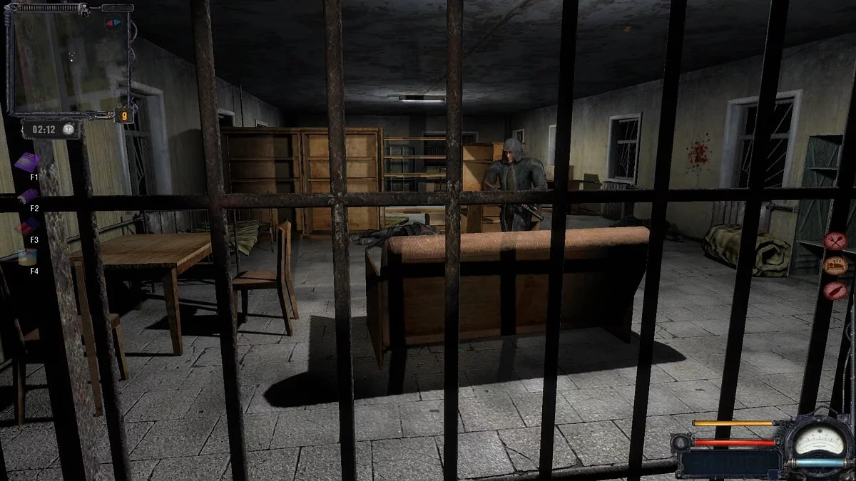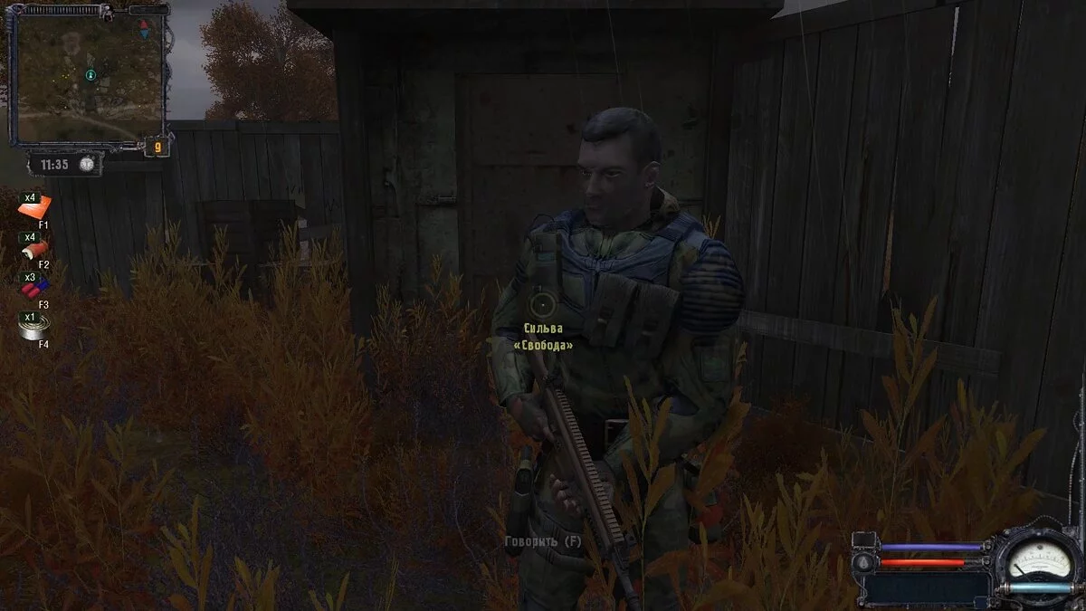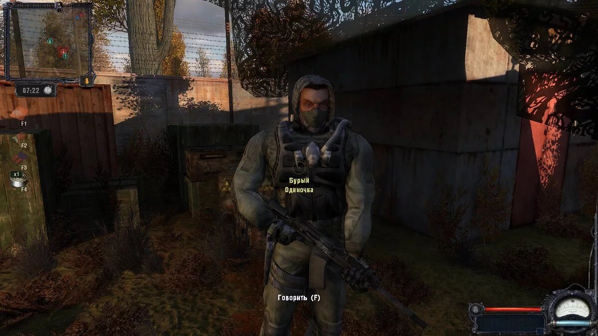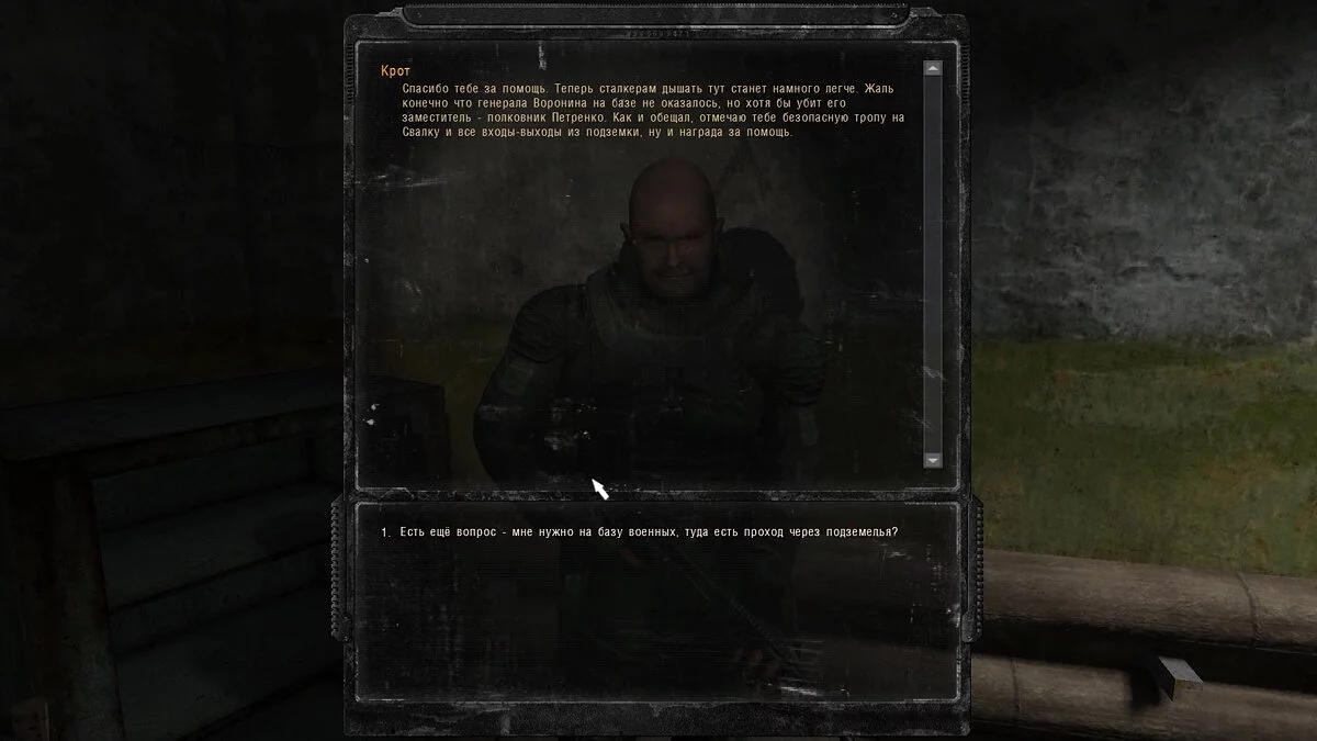Оказавшись на базе Долга, помогите сталкерам расправиться с оставшимися врагами. Если у вас нет боеприпасов, одолжите у трупов другое оружие. Когда все враги будут убиты, пообщайтесь с Серым — нас он ждал в здании на первом этаже. Также поднимитесь на третий этаж и поболтайте с Кротом.