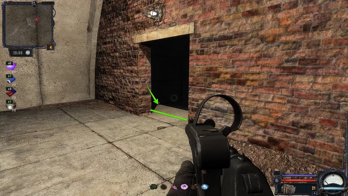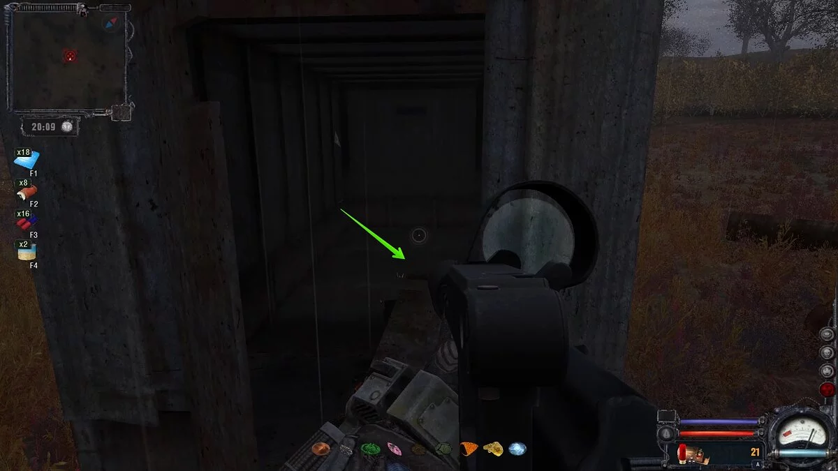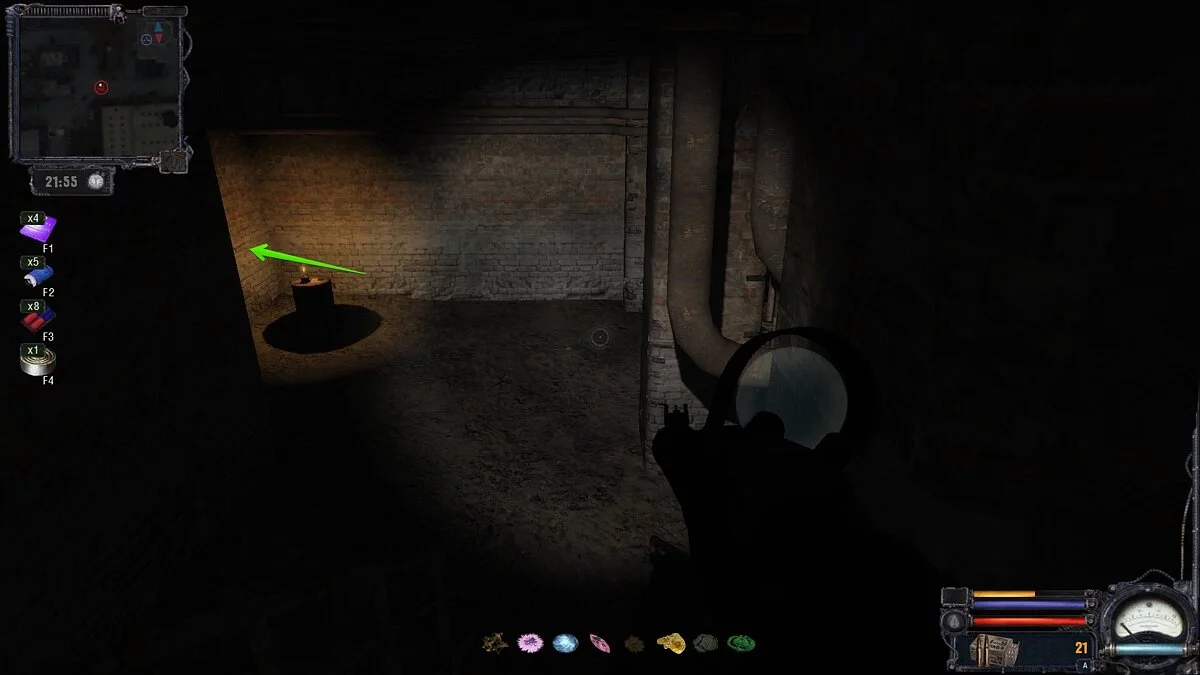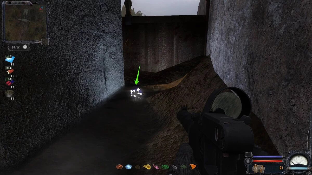 Последний заложить сложнее. Доберитесь до входа в бункер, где сидит главарь, но выключите фонарь. Справа от входа есть здание и спуск в подвал. Спуститесь на два уровня — здесь вы найдёте уникальный артефакт.