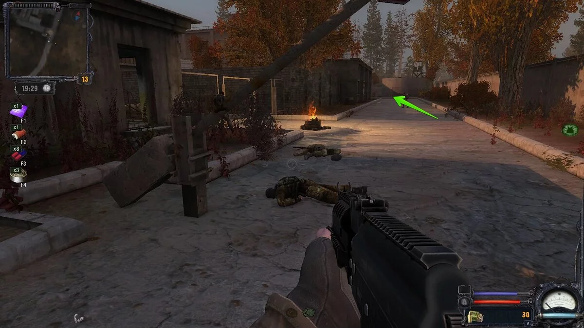 Отдайте КПК Мире и бегите за маркером на карте, где нужно отыскать трупы ещё двух сталкеров. Здесь же будут ждать несколько химер. Избавьтесь от мутантов и осмотрите гаражи — один труп лежит в дальнем гараже во втором проходе слева, а второй в большом ремонтном ангаре. Ориентируйтесь по серым точкам на мини-карте, чтобы быстро найти их.