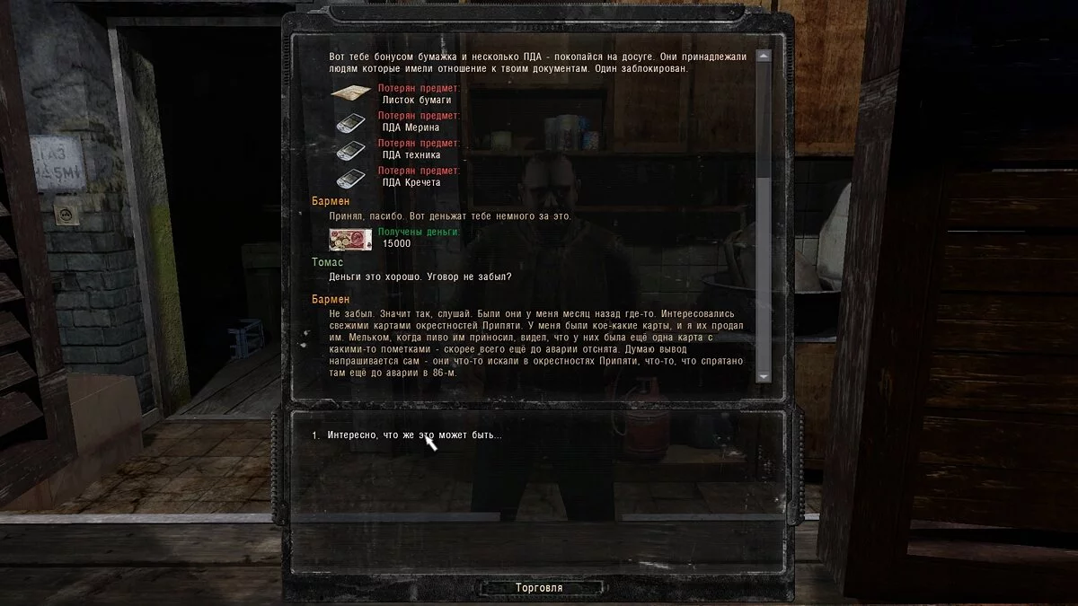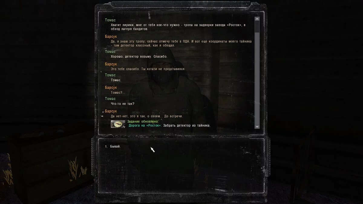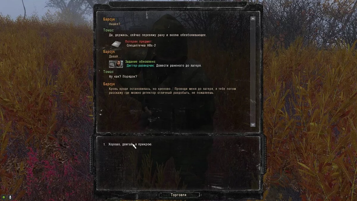 Торговец согласится помочь и попробует навести справки по группе сталкеров, которую ищет Томас, но вместе с этим подкинет небольшую работенку. Нужно избавиться от главаря бандитов, что обосновались в деревушке поблизости. Просто следуйте за маркером и смотрите небольшую катсцену, после которой не забудьте обыскать схрон мёртвого бандита.