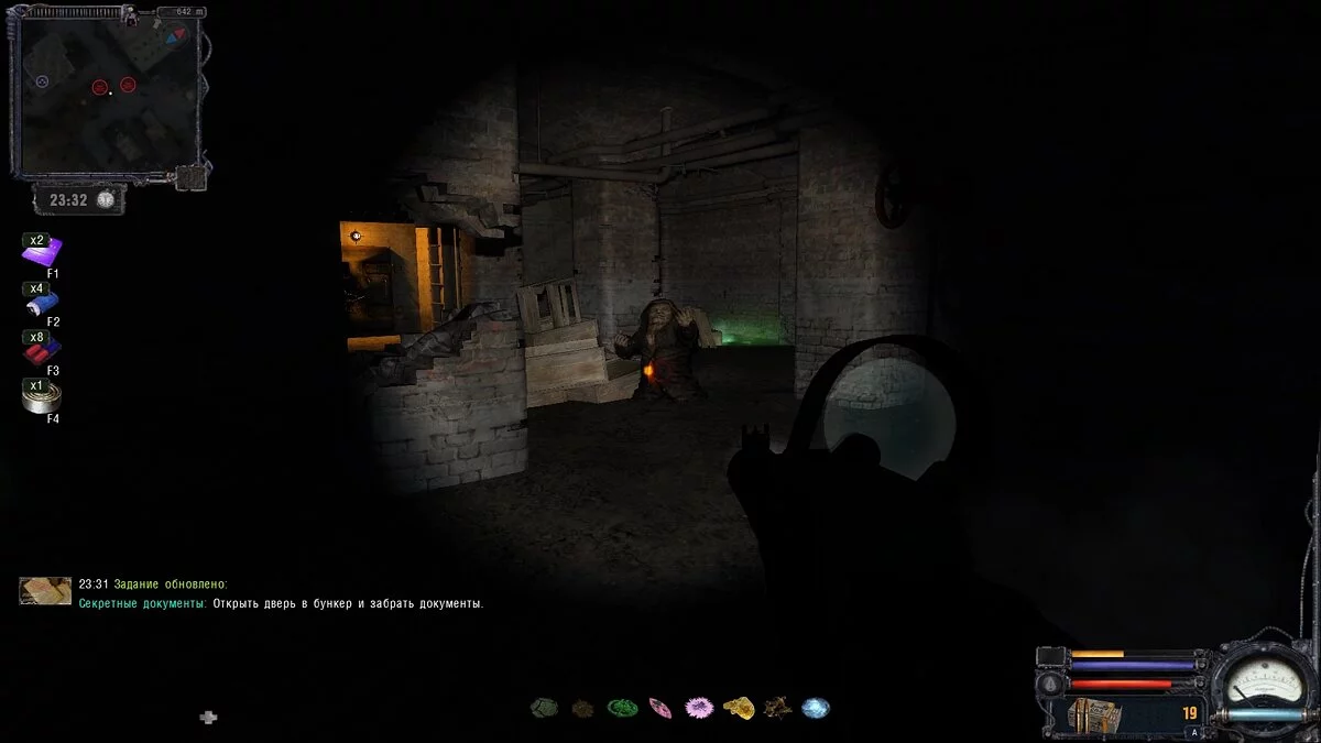 После беседы со свободовцем на карте появится отметка. Следуйте в эту область, уничтожьте несколько карликов и бюрера, а затем спуститесь по лестнице вниз. Там будет ждать единственный кровосос. В тупике отыщите тело военного и подберите ключ.