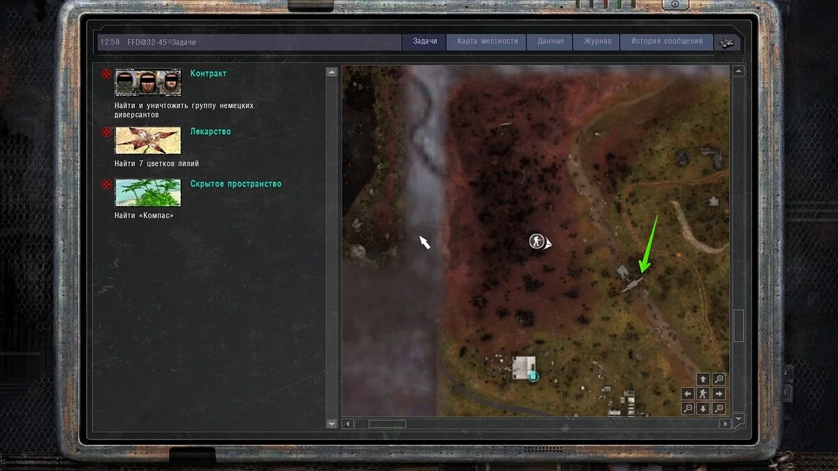 Вернитесь на стартовую локацию и поговорите с Сидоровичем. Он не скажет, где находится переход на территорию Каньона, однако даст подсказку, что для этого необходимо отыскать артефакт «Компас». Для этого отправляйтесь в отмеченную область на нашей карте (в самой игре маркера не будет).