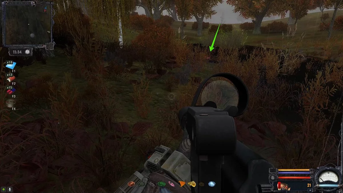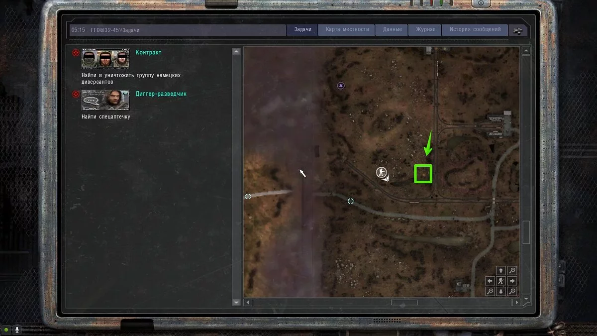 В левой части локации появится ещё одна отметка рядом с аномалией «Разлом». Отправляйтесь в эту область и отыщите раненного сталкера. Задание обновится — в правой верхней части экрана появится таймер. За отведённое время вам нужно отыскать группу бандитов и отобрать специальную аптечку. Можете сильно не спешить, а просто отправиться к точке, которая изображена на карте ниже.