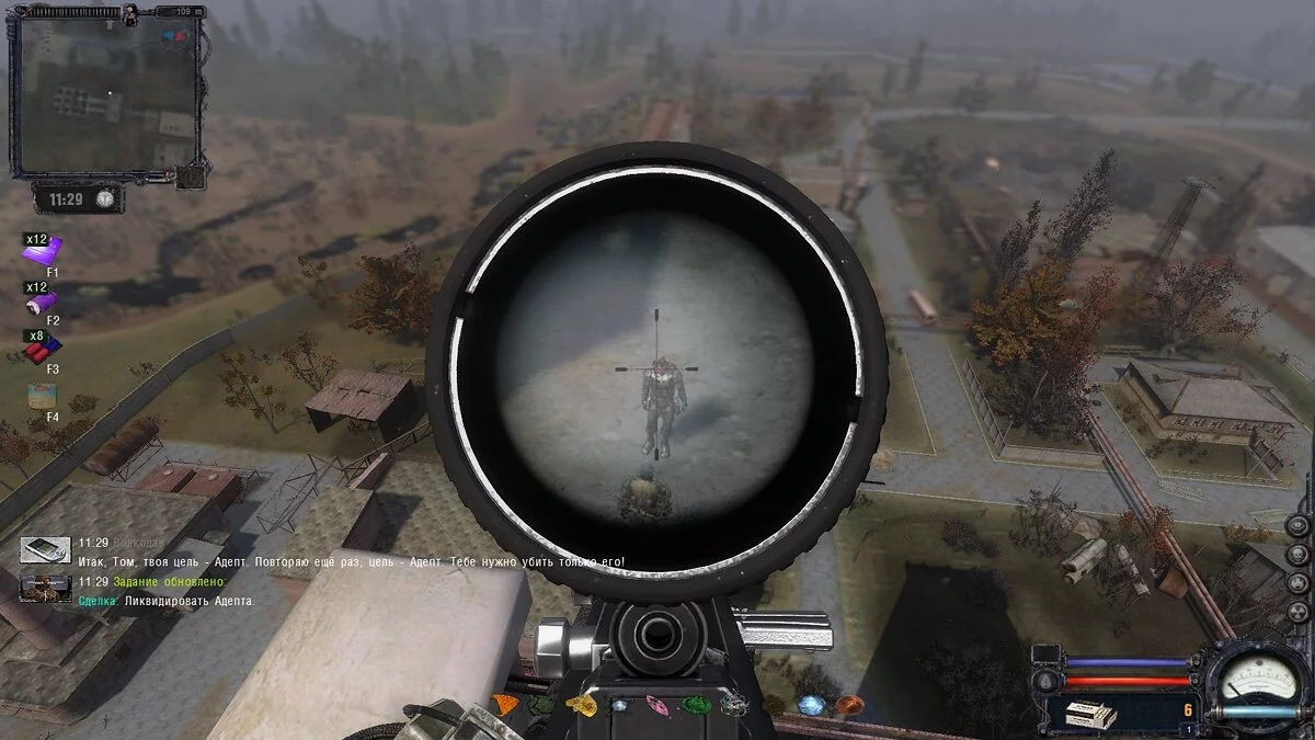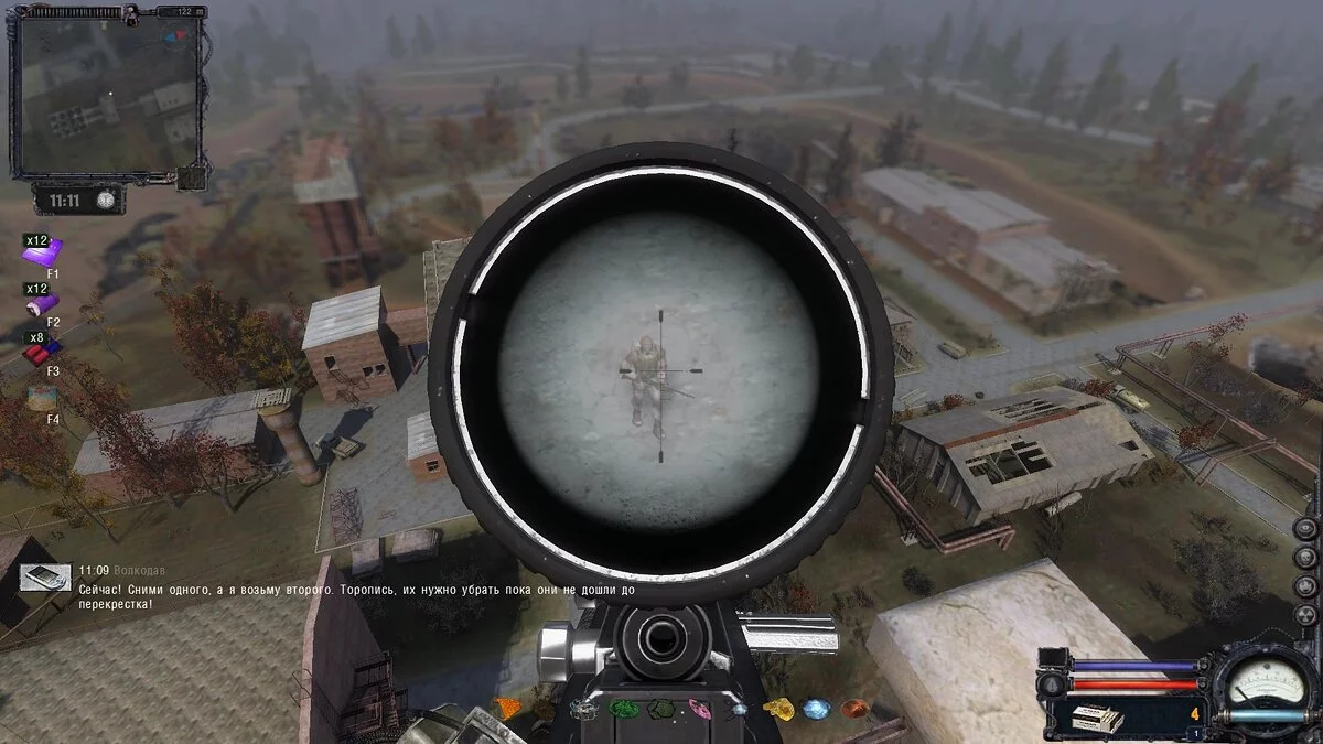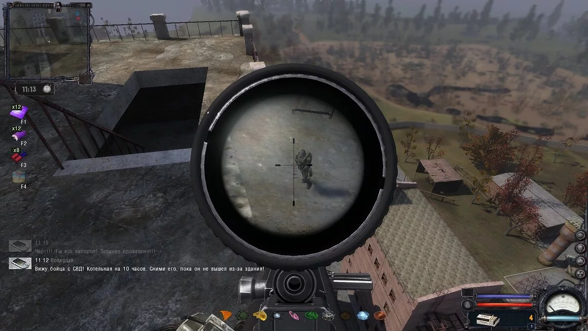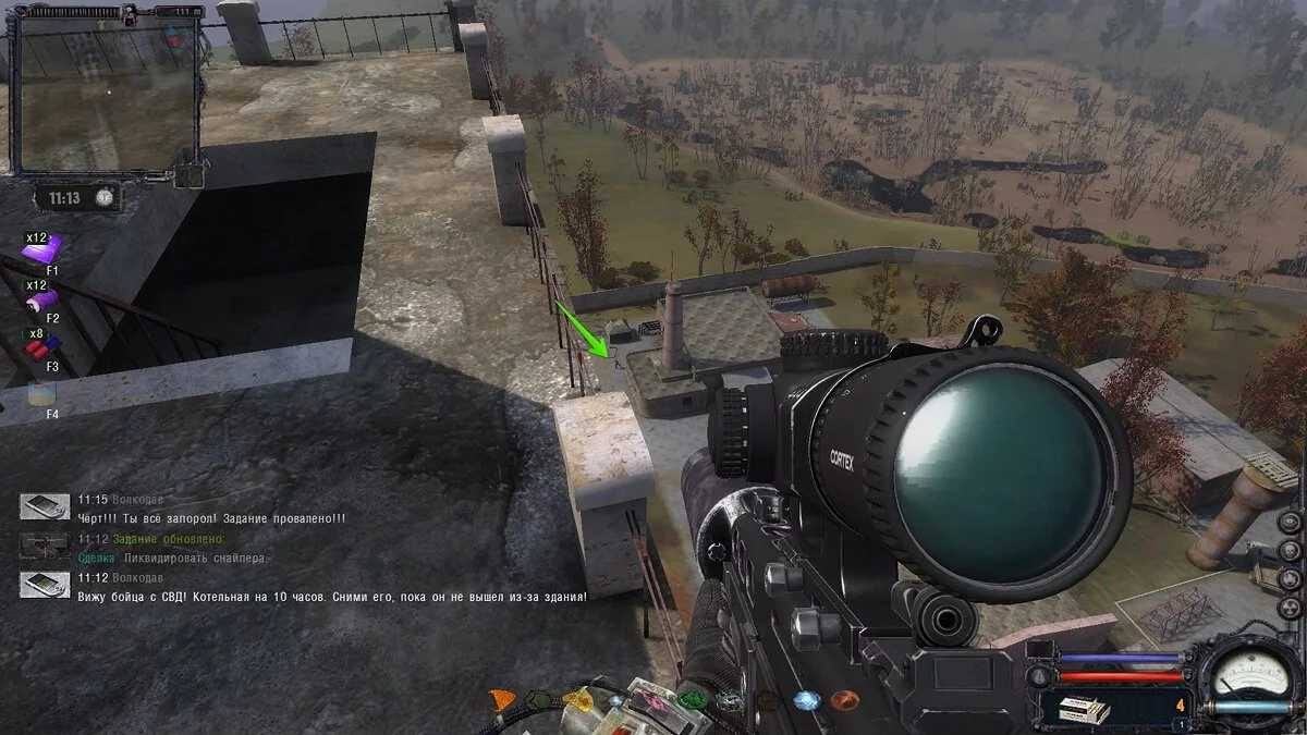 В следующем сообщении будет сказано, что враг с СВД направляется из здания котельной на 10 часов (с левой стороны). Посмотрите в эту сторону и стреляйте, пока противник не скрылся из зоны видимости.
