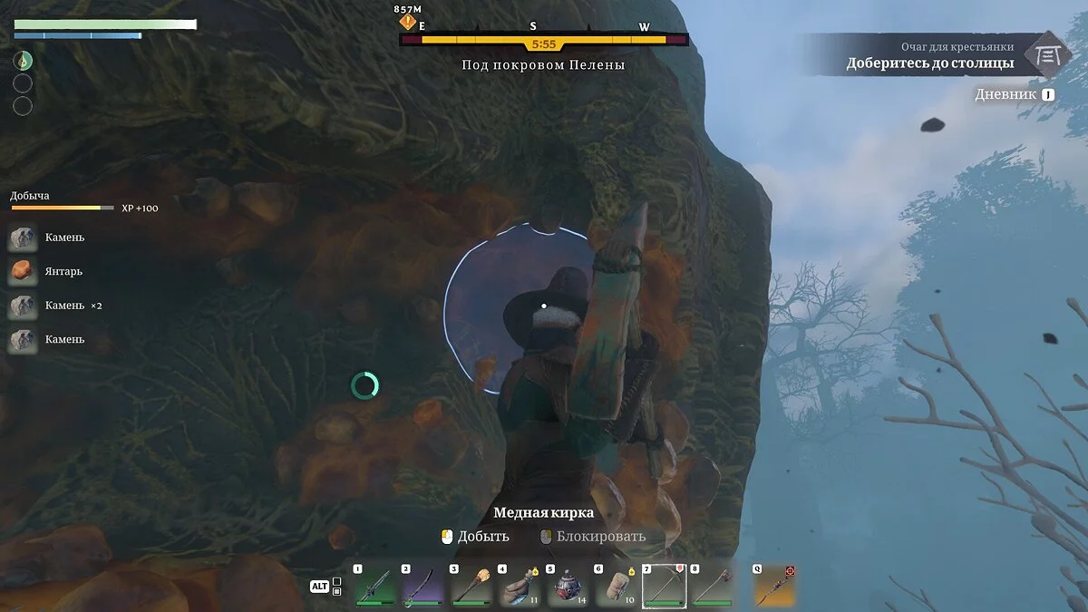 Янтарь защищен Пеленой, которая убьет слабого персонажа. Чтобы начать добычу, придется усилить Алтарь Пламени до третьего уровня. Так вы расширите зону доступной застройки и сможете отогнать Пелену.