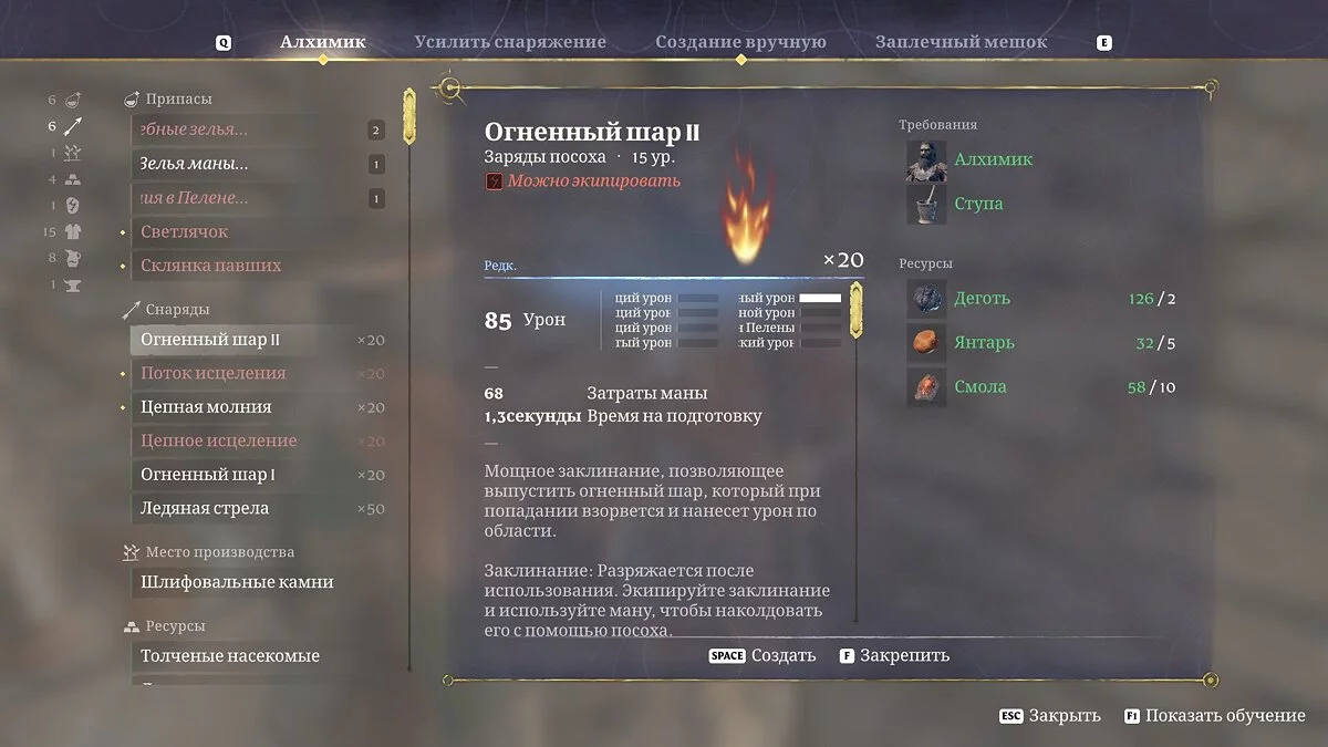 Если отыгрываете мага, обратите внимание на усиленный вариант заклинания «Огненный шар», для открытия которого понадобится 5 единиц янтаря. После получения 17 уровня нужно выполнить квест Алхимика, после чего, собрав 50 единиц янтаря, вы сможете разблокировать «Вечный огненный шар» — заклинание станет бесконечным.