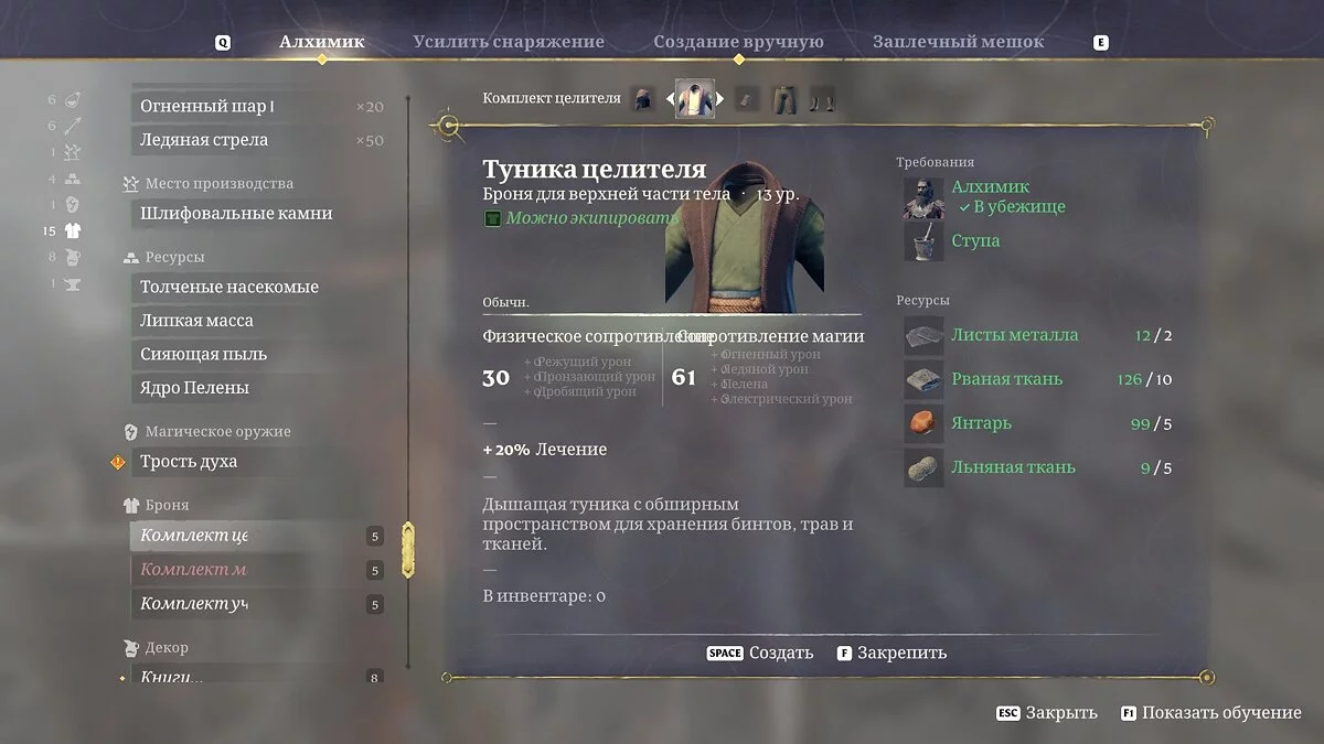 Улучшая или покупая снаряжение, вы откроете наряд «Ученик алхимика». Прокаченная версия за 14 единиц янтаря даст вам броню мага, которая усиливает заклинания и увеличивает запас маны. В дальнейшем все снаряжение мага так или иначе будет требовать янтарь, поэтому добывать его лучше с запасом.
