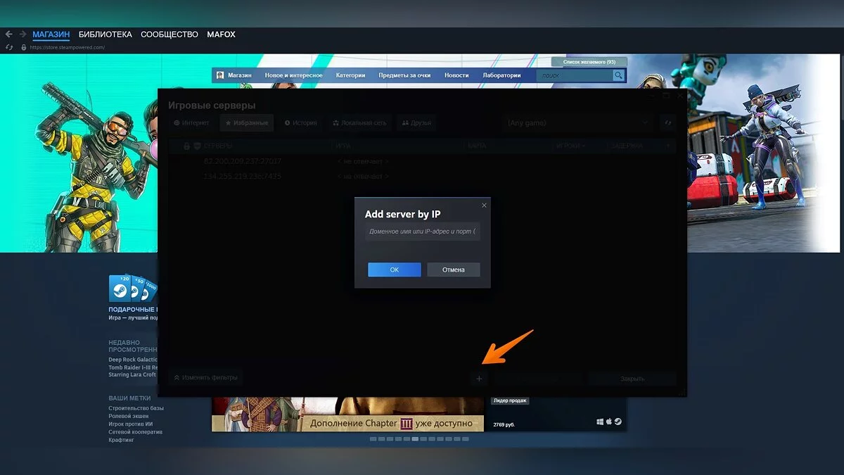 Чтобы быстрее подключать сервер, можно добавить его в избранное. Для этого выполните следующее: