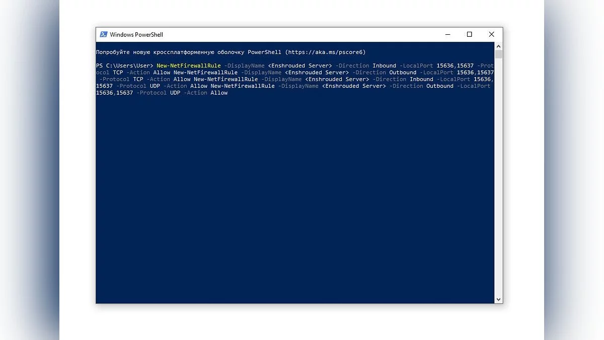 New-NetFirewallRule -DisplayName «Enshrouded Server» -Direction Inbound -LocalPort 15636,15637 -Protocol TCP -Action Allow New-NetFirewallRule -DisplayName «Enshrouded Server» -Direction Outbound -LocalPort 15636,15637 -Protocol TCP -Action Allow New-NetFirewallRule -DisplayName «Enshrouded Server» -Direction Inbound -LocalPort 15636,15637 -Protocol UDP -Action Allow New-NetFirewallRule -DisplayName «Enshrouded Server» -Direction Outbound -LocalPort 15636,15637 -Protocol UDP -Action Allow