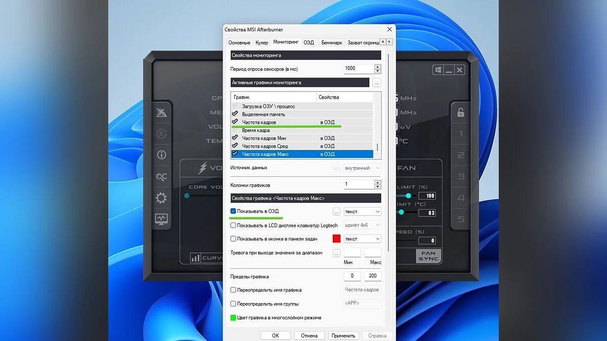- В окне настроек перейдите на вкладку «Мониторинг». Здесь вы найдете список всех возможных параметров для отслеживания. Отметьте те, которые хотите видеть на экране, включая FPS, и активируйте опцию «Показать в ОЭД» для каждого из них.