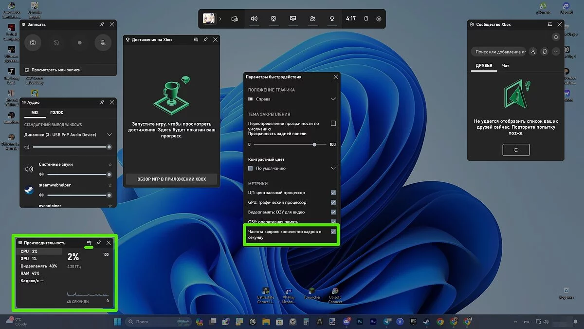 После настройки вы сможете закрепить счетчик FPS в удобном месте на экране, чтобы он был виден даже при скрытой панели. Кроме того, игровая панель Xbox позволяет отслеживать и другие ключевые показатели производительности, включая загрузку процессора и видеокарты, что делает её мощным инструментом для геймеров.