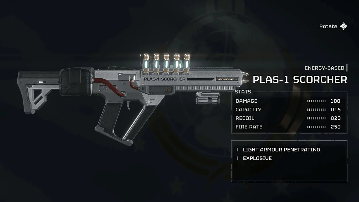Плазменная винтовка наносит наибольший урон по площади. Эффективна против любых видов противников, однако опасна в неумелых руках. Рассматривайте это как альтернативу ракетнице в ситуациях, когда вам нужно иметь дело с большими группами более мелких врагов. Игра не подразумевает PVP режим, однако на каждом задании активен огонь по своим, а при неправильном использовании винтовки можно сильно усложнить игру товарищам по команде.
