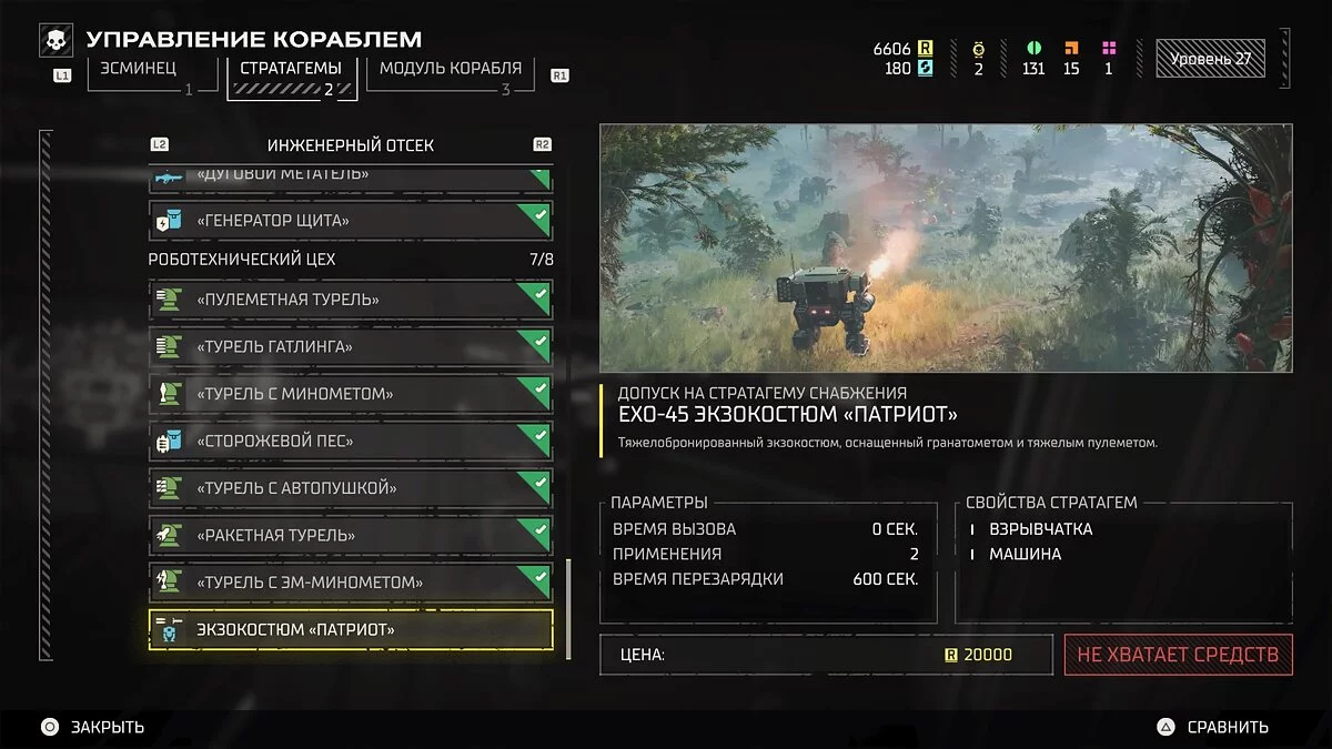 После недавнего обновления в игру добавили меха, который называется Экзокостюм «Патриот». Машина оснащена пулеметом и мобильной ракетной установкой, а стоит аж 20 000 валюты. Прежде чем на нее копить, нужно знать несколько нюансов. Во-первых, экзоскелет довольно медленно перемещается, не умеет прыгать, а также из него нельзя вызывать стратагемы. Во-вторых, броня машины очень слабая и выдерживает один-два удара, после чего загорается и почти сразу взрывается. Ракеты и пули также не бесконечны. Все это делает новую фишку полезной лишь в некоторых ситуациях. В тяжелом бою «Патриот» скорее мешает, а вот в обороне или при ожидании эвакуации — очень пригодится. В любом случае мы рекомендуем открыть сначала все из вышеописанного, а уже потом тратить свои кровные кредиты на новую игрушку.