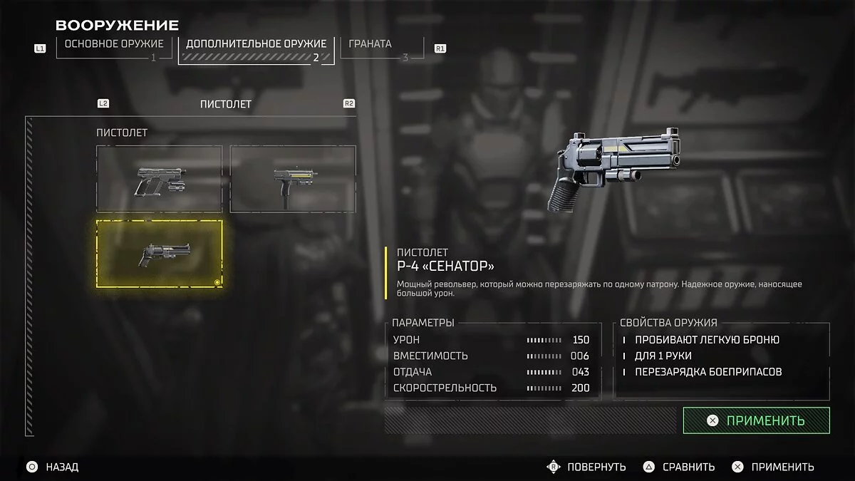 Выбор дополнительного оружия существенно меньше. Начальный пистолет P-2 «Миротворец» поможет лишь на легких уровнях. Как можно быстрее замените его на P-19 «Избавитель». Здесь и скорострельность выше и магазин побольше. С ним вы проведете все оставшееся время игры. Однако, если купили или открыли премиальный пакет, то можете получить пистолет, сильно напоминающий револьвер — P-4 «Сенатор». Это медленный, но достаточно мощный ствол, чей урон гораздо выше «Избавителя». Только помните, что перезаряжаться придется долго и часто.