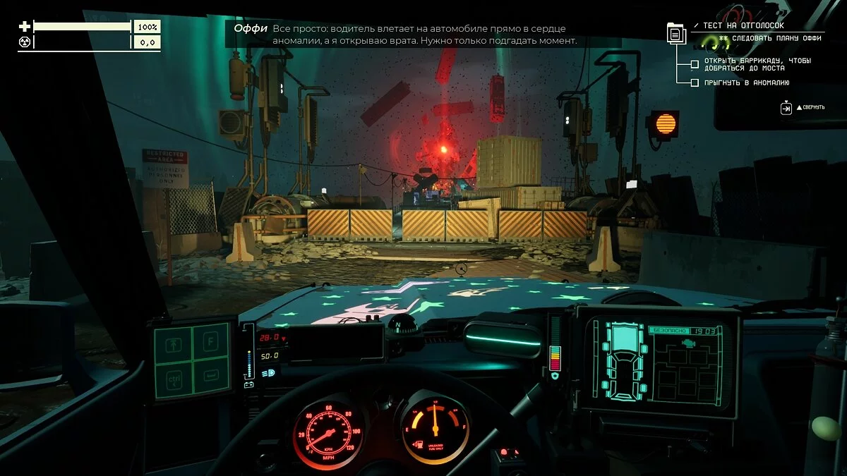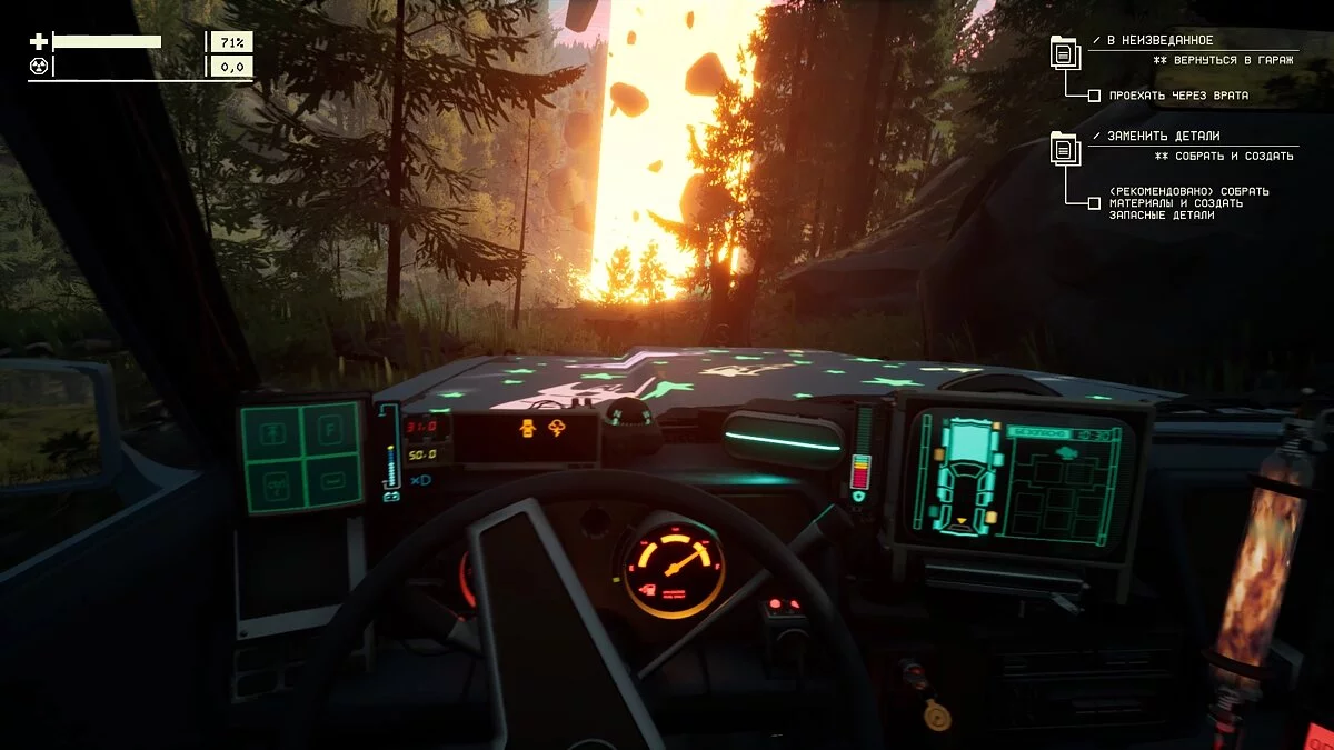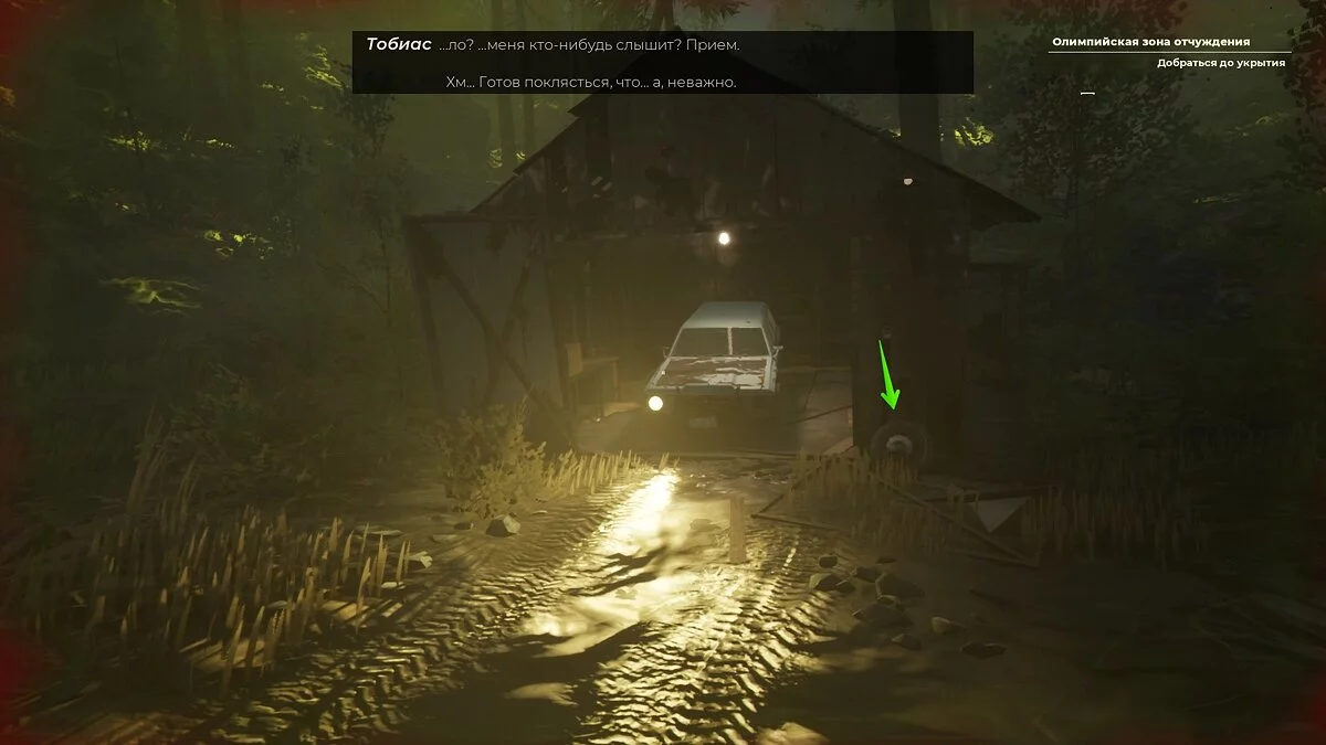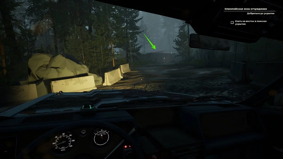 С этого момента на пути будет появляться желтая пелена — особые аномалии. Старайтесь как можно быстрее проезжать мимо них, так как герой будет терять здоровье. Добравшись до развилки, поверните направо, к большому гаражу. Он и станет вашей основной базой.