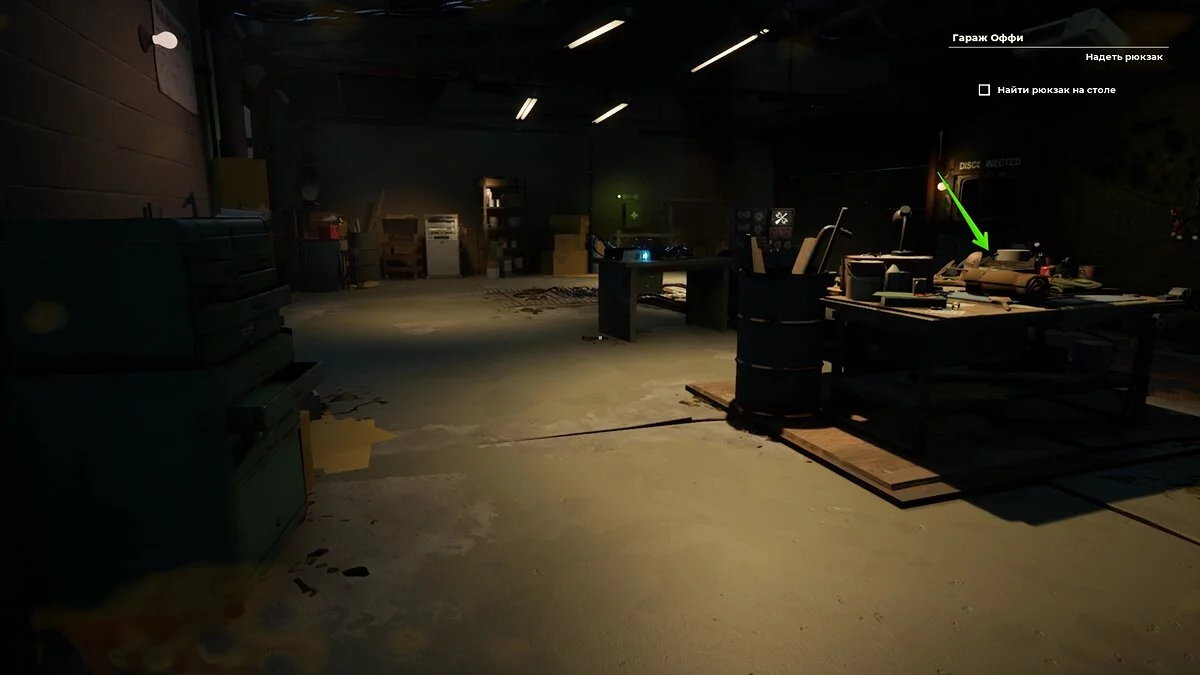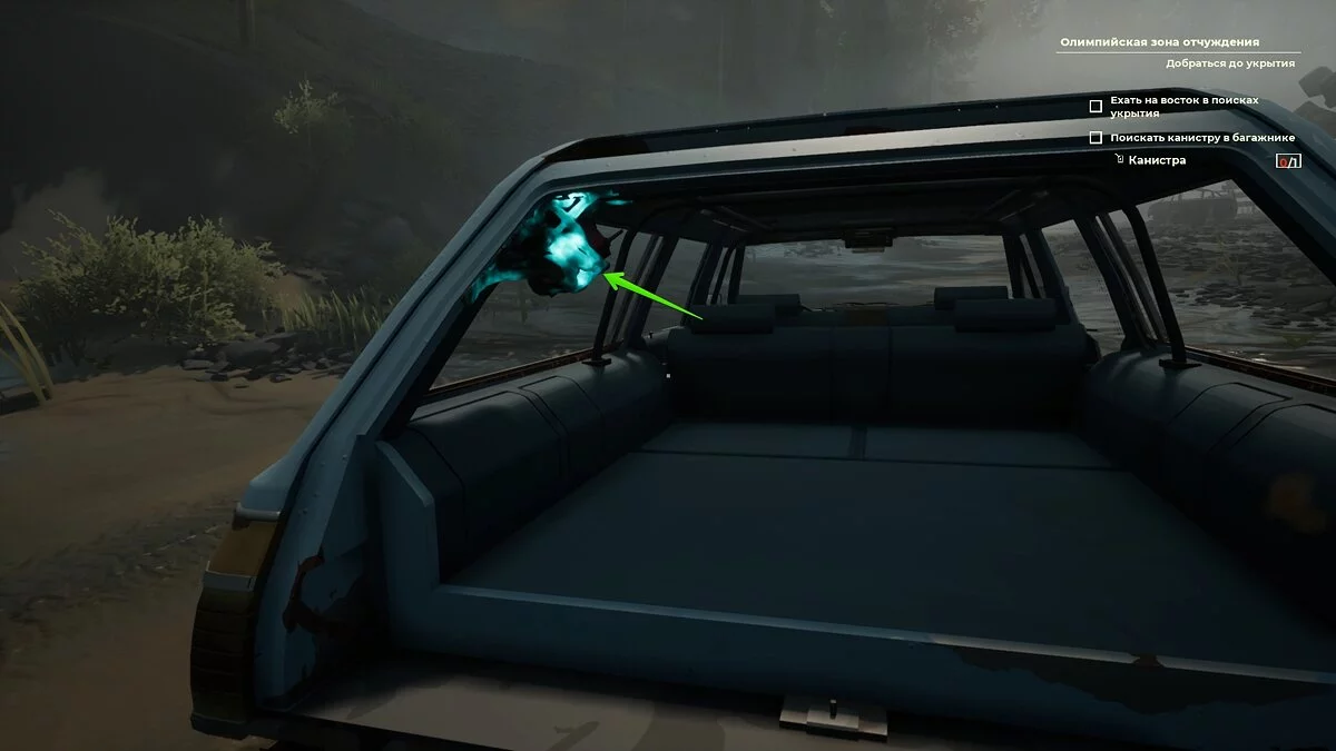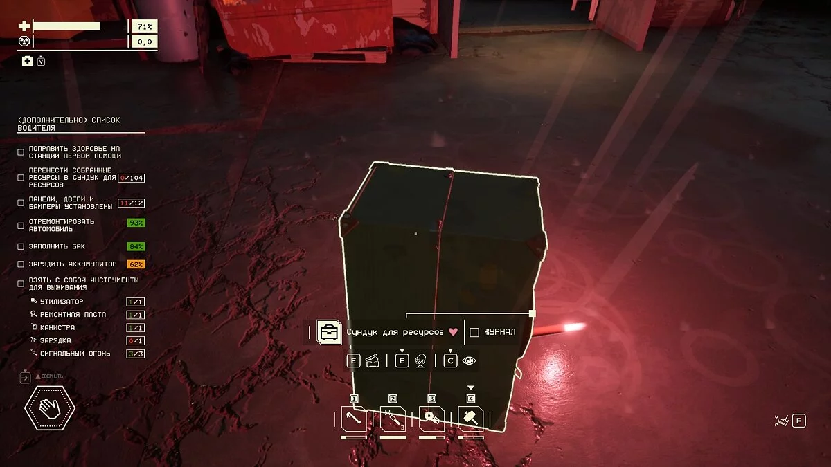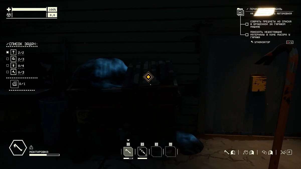 Воспользуйтесь аптечкой на стене в дальней части гаража и загоните свой автомобиль внутрь. На локации появится маркер отлетевшего колеса. Подберите его и снова установите на транспорт. Теперь вам нужно собрать определённое количество ресурсов для создания кустарной двери. Найдите в гараже монтировку и с её помощью взломайте багажник разрушенного авто на улице. Взаимодействуйте с мусорным баком, чтобы получить первый утилизатор. Мусорный бак, к слову, можно использовать как бесконечный источник ресурсов.