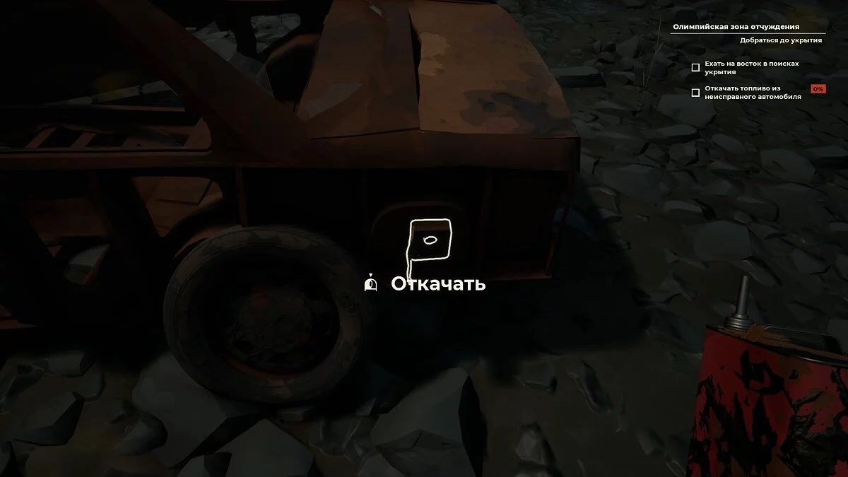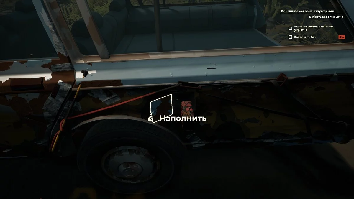 Езжайте прямо, а через несколько сотен метров автомобиль заглохнет — закончится бензин. Прямо перед вами будет стоять еще один транспорт, где можно откачать немного топлива. Чтобы сделать это, вернитесь к багажнику вашего нового авто и заберите канистру. Взаимодействуйте с бензобаком разрушенной машины и заправьте свою.