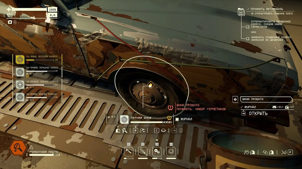 Сделав это, задание обновится. Отыщите в гараже ремонтную пасту и отремонтируйте отдельные детали машины. Также замените спущенное колесо запаской (можно отыскать в гараже или создать на верстаке) или скрафтите набор герметиков.