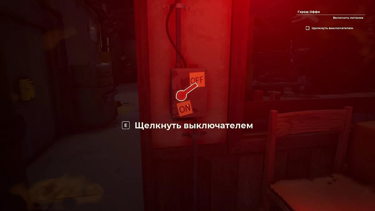 Оказавшись внутри, взаимодействуйте с рубильником на стене рядом с красной лампочкой.