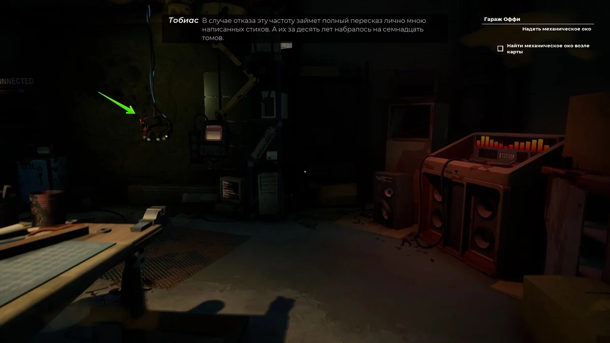Справа от стола, где вы подобрали рюкзак, есть механическое око. С его помощью вы сможете сканировать объекты и переключаться между предметами в своём инвентаре.