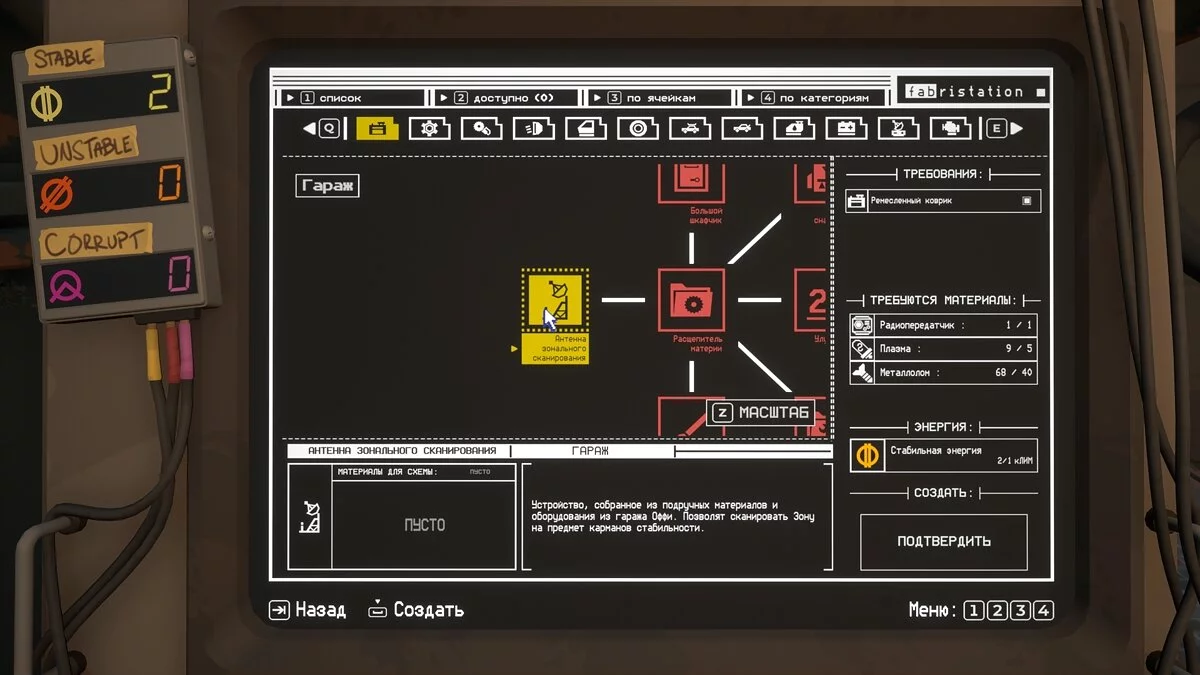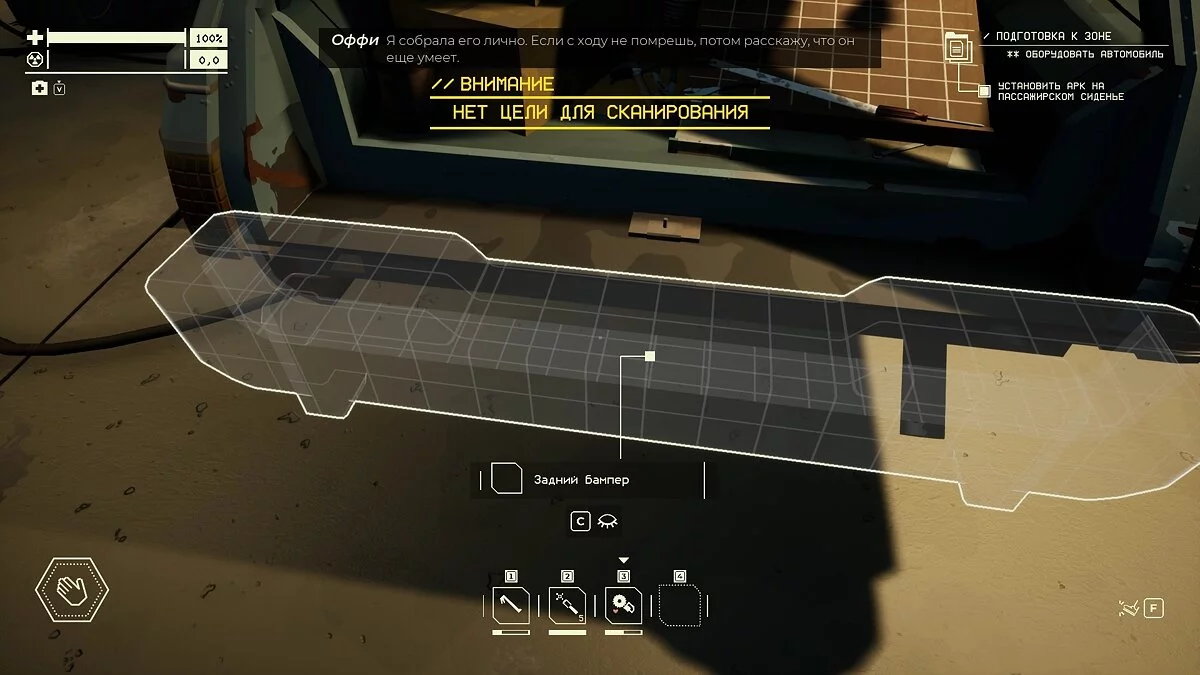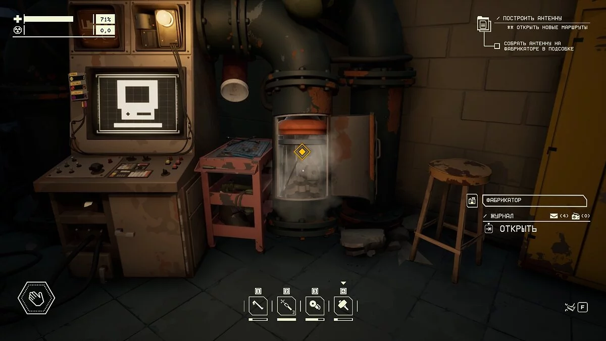 Вернувшись в гараж, первым делом воспользуйтесь ударным молотом и выбейте дверь в подсобку. Здесь вы найдёте специальное устройство — фабрикатор. Взаимодействуйте с ним и создайте антенну зонального сканирования. Она появится справа от фабрикатора.