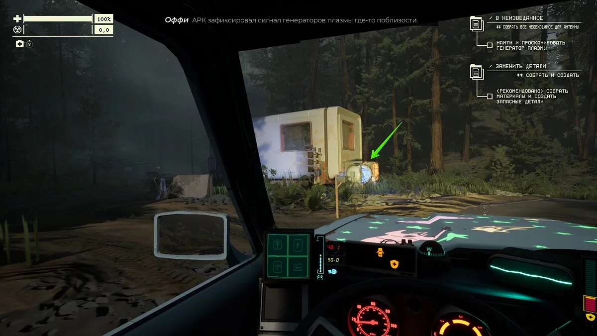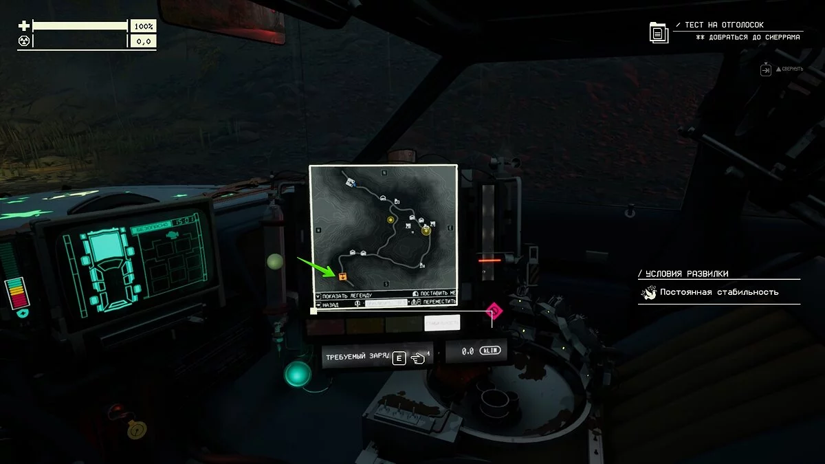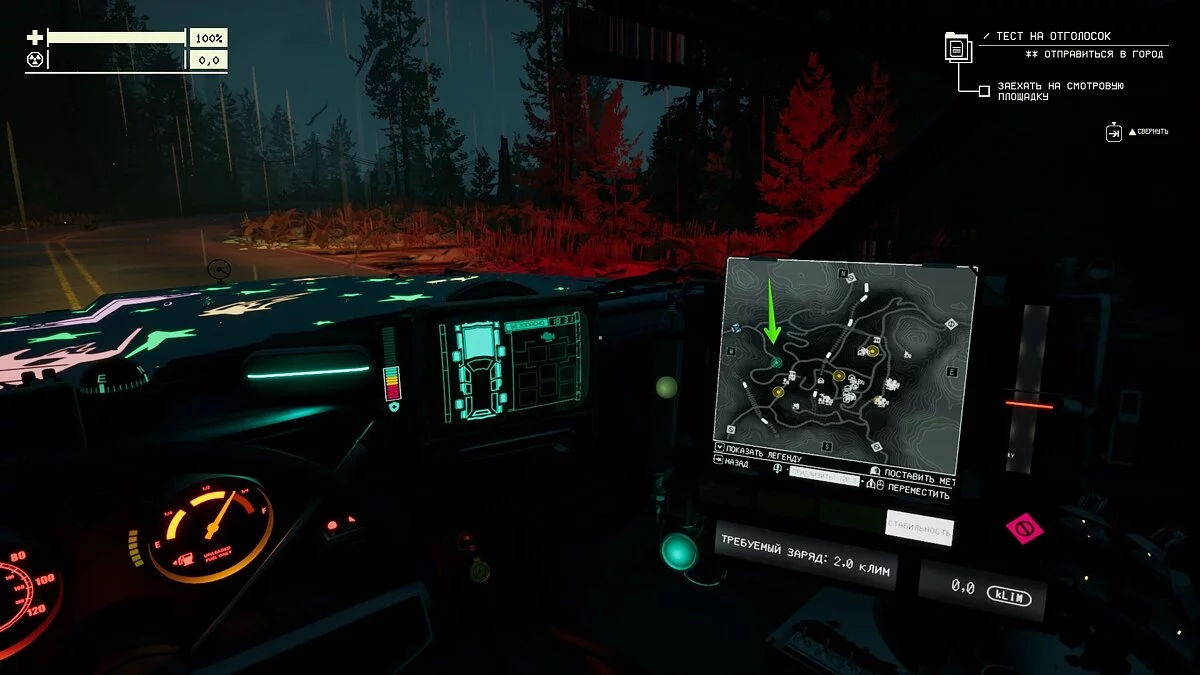На карте появятся три отметки. Отправляйтесь к любой из них и заберите светящуюся сферу — якорь. Поместите его в APK на пассажирском сидении, затем выберите место для создания портала. Следуйте в отмеченную область и направьте автомобиль в большой столп света. Вылазка будет завершена.