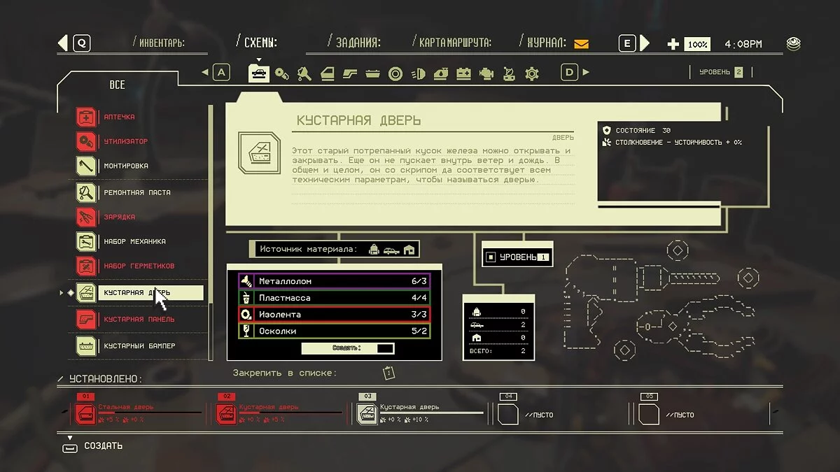 В багажник положите картонные коробки (импровизированное хранилище), ремесленный коврик (верстак) и APK (карту) на пассажирское сидение. Всё это вы также найдёте в гараже. Перед вылазкой советуем разобрать несколько автомобилей и других предметов, чтобы скрафтить недостающие двери, фары и бампера (опционально).