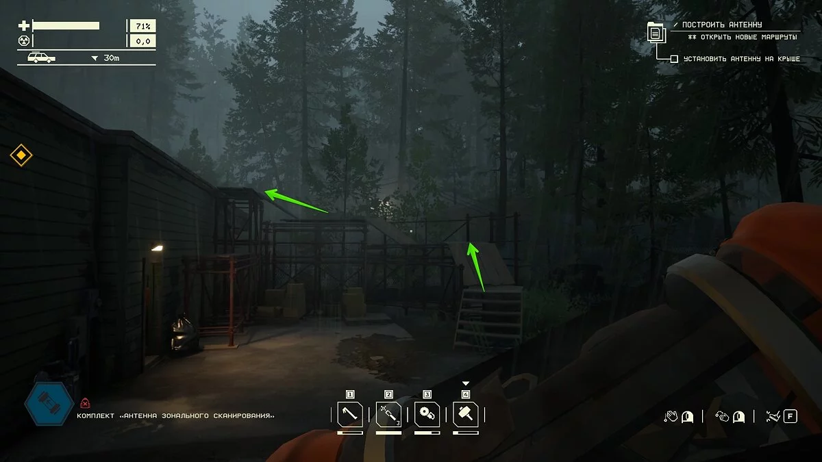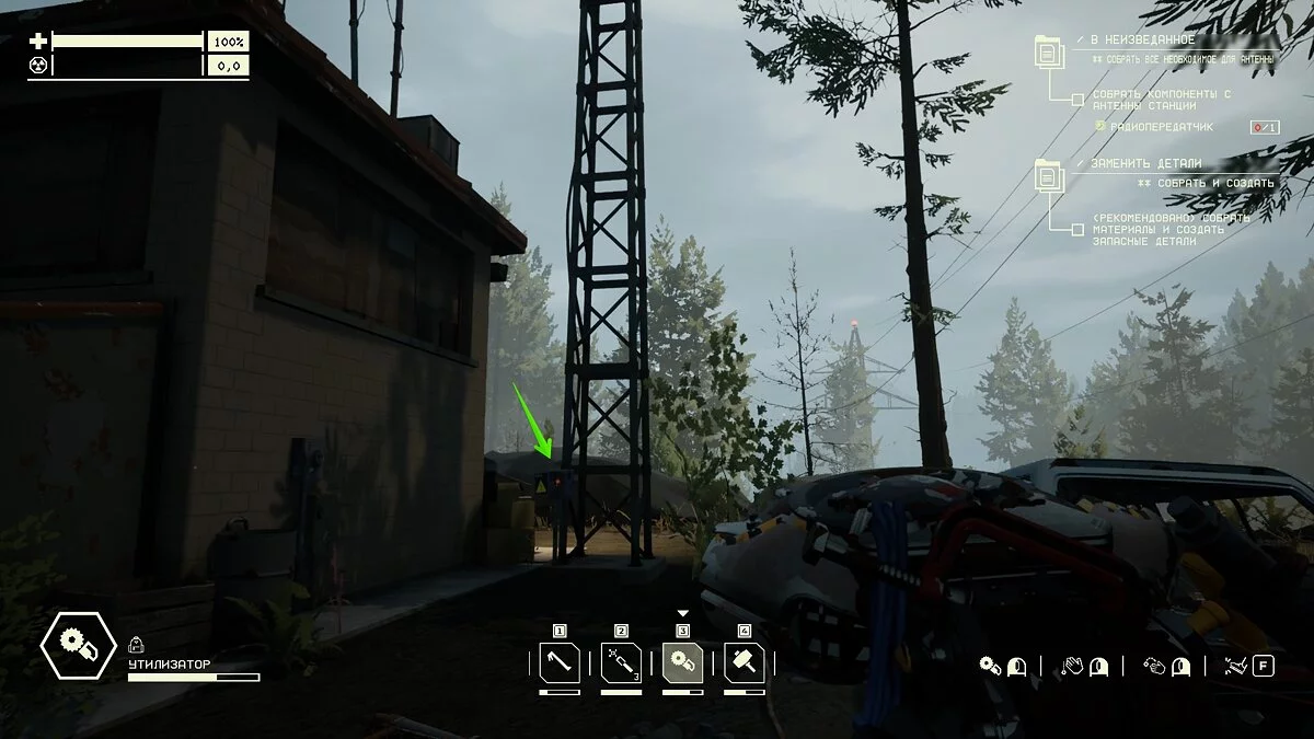 Сверьтесь с картой и езжайте за маркером. На возвышенности вы найдёте радиовышку, где можно раздобыть радиопередатчик. Заходить в здание не нужно — осмотрите правую часть строения и найдите электрощиток.
