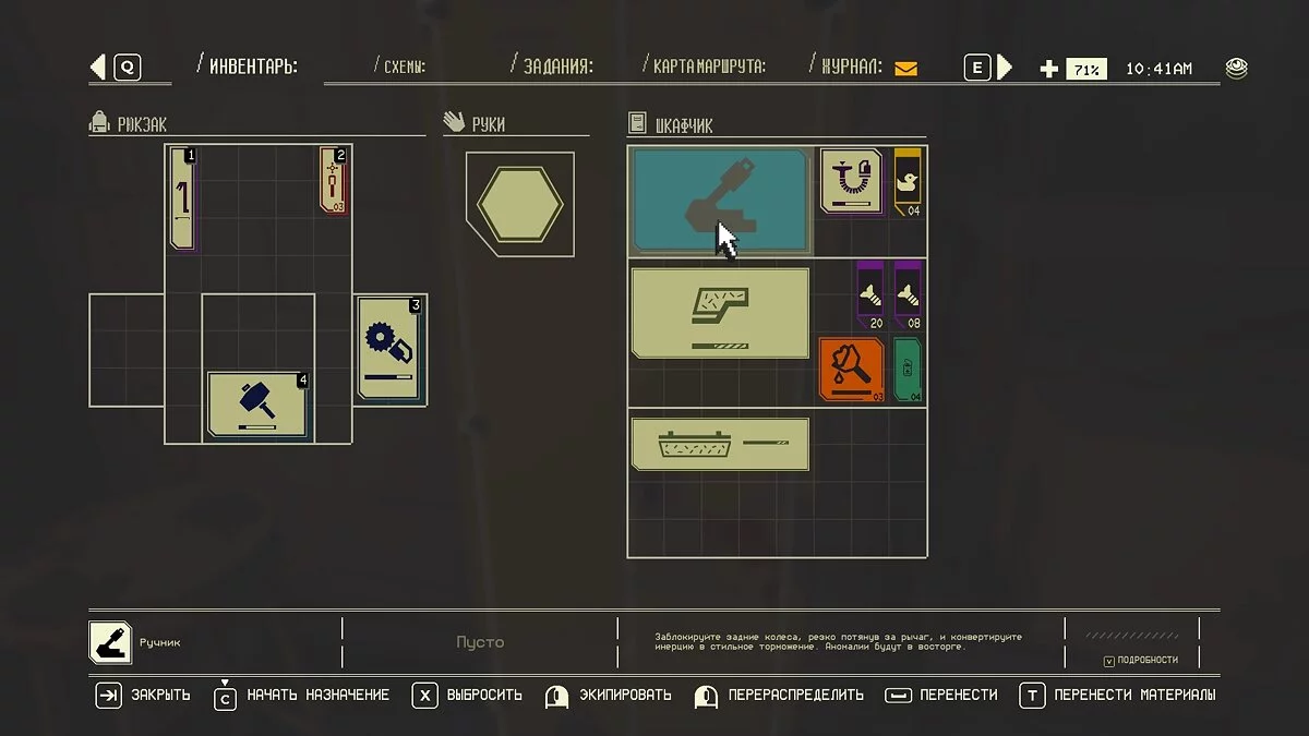 Вернитесь в подсобку и осмотрите камеру хранения. Внутри есть ручник — заберите его, откройте капот и разместите в автомобиле.