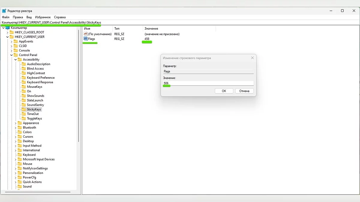 - Перейдите по пути «КомпьютерHKEY_CURRENT_USERControl PanelAccessibilityStickyKeys» (вы можете скопировать и вставить адрес без кавычек, затем нажать Enter).