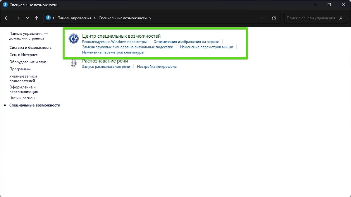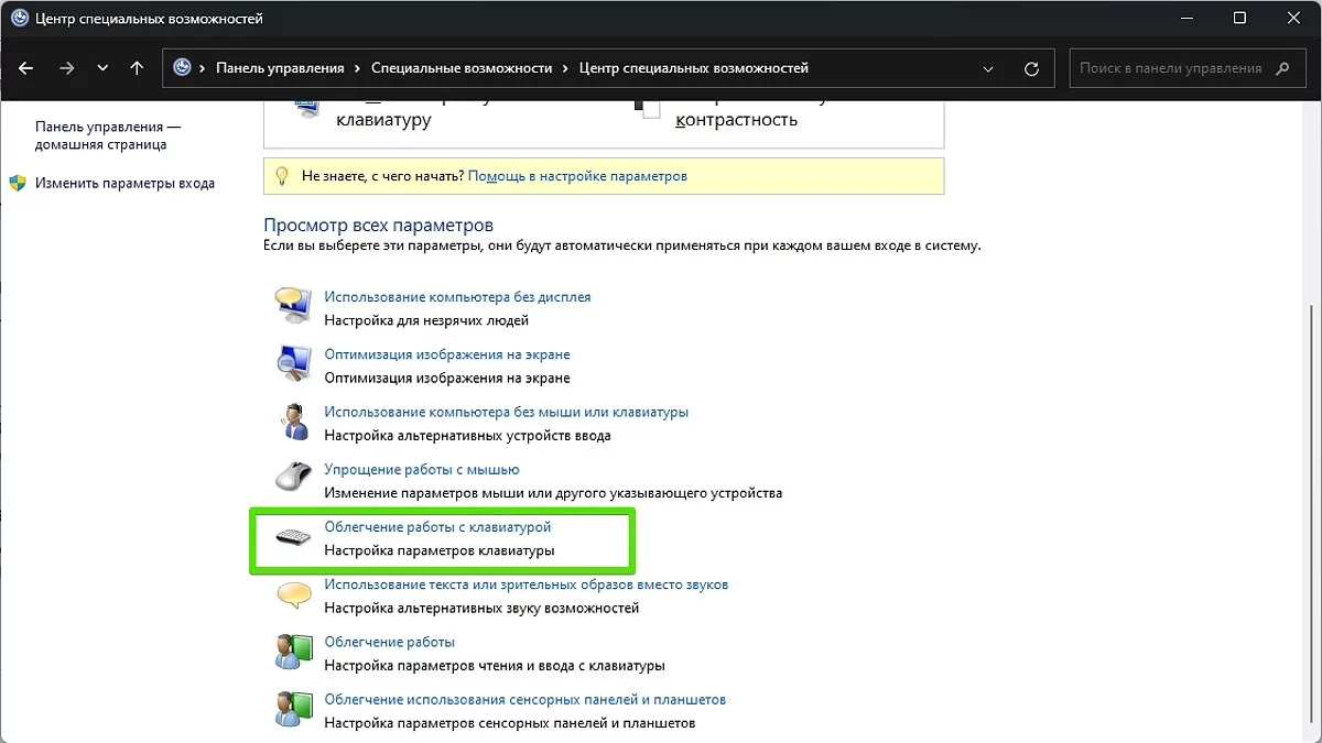 - Откройте меню «Центр специальных возможностей» и выберите «Облегчение работы с клавиатурой».