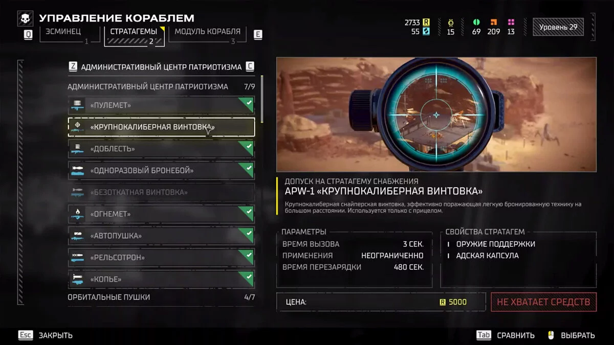 «Крупнокалиберная винтовка» представляет собой эффективное снайперское оружие поддержки, доступное для выбора перед миссией или для обнаружения и подбора в местах интереса и целевых зонах во время выполнения заданий. Рекомендуется приобрести данный стратагем, особенно если у вас ограничены возможности по использованию бронебойного оружия.
