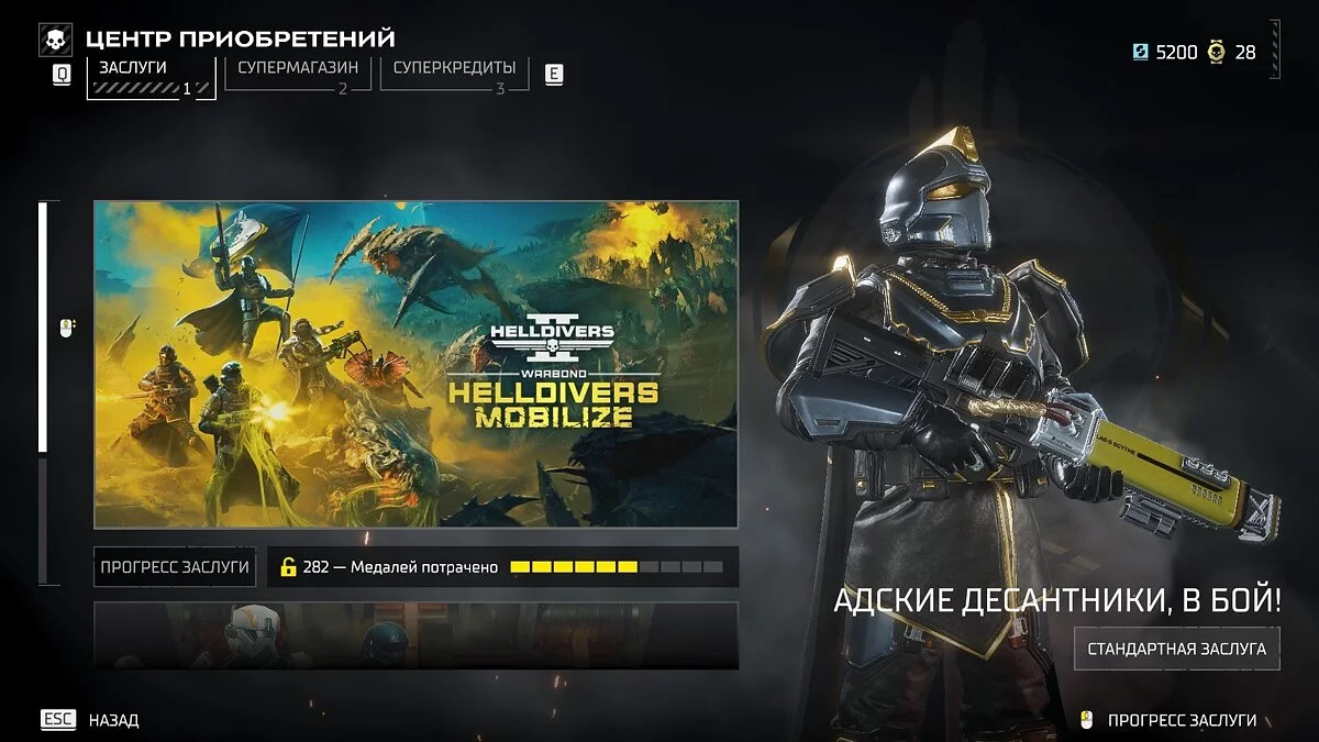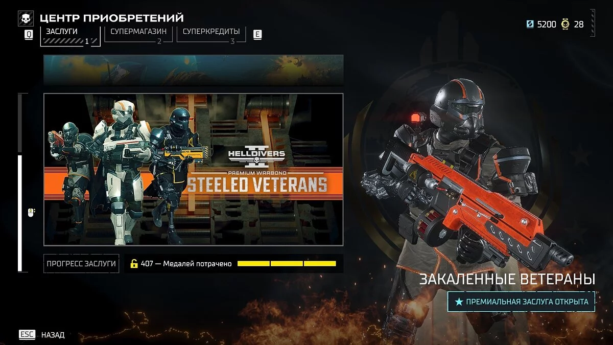 Первый баттл-пасс (его называют «Заслуга») поделен на две части: бесплатный и Steeled Veterans. Первая дает базовый набор предметов, с которыми проще «устанавливать демократию» на оккупированных планетах. Вторая предлагает более продвинутую амуницию для эффективного устранения противников на более высоких сложностях.