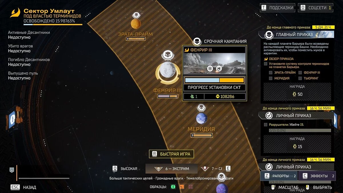 Откройте галактическую карту и выберите самую низкую сложность. Далее переместите курсор в правую сторону и выделите ту часть галактики, где происходят столкновения с жуками. Выберите планету, на которой игроки в данный момент пытаются оттеснить натиск противника. Мы советуем брать планеты с низким уровнем растительности по типу «Эрата-прайм» и «Фенрир III». Так вам будет проще находить тайники и замечать сигнальные огни капсул с припасами.