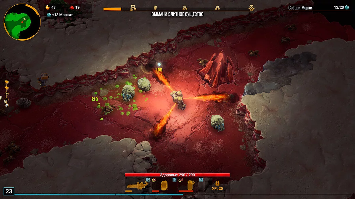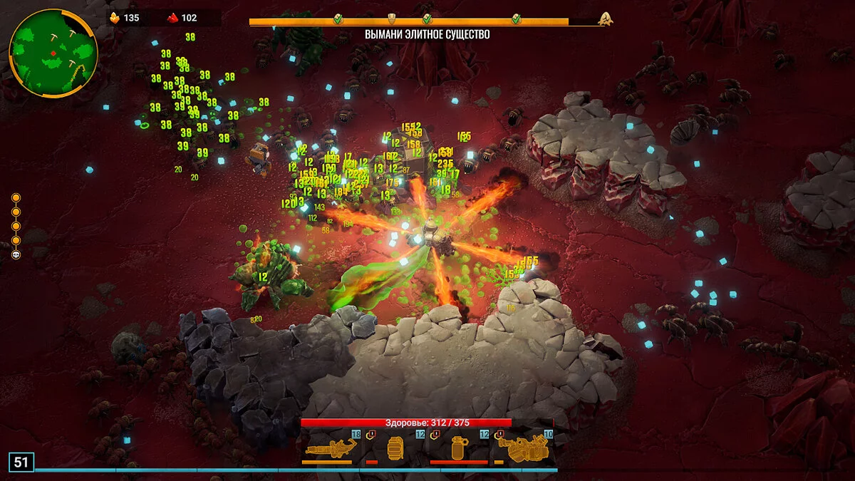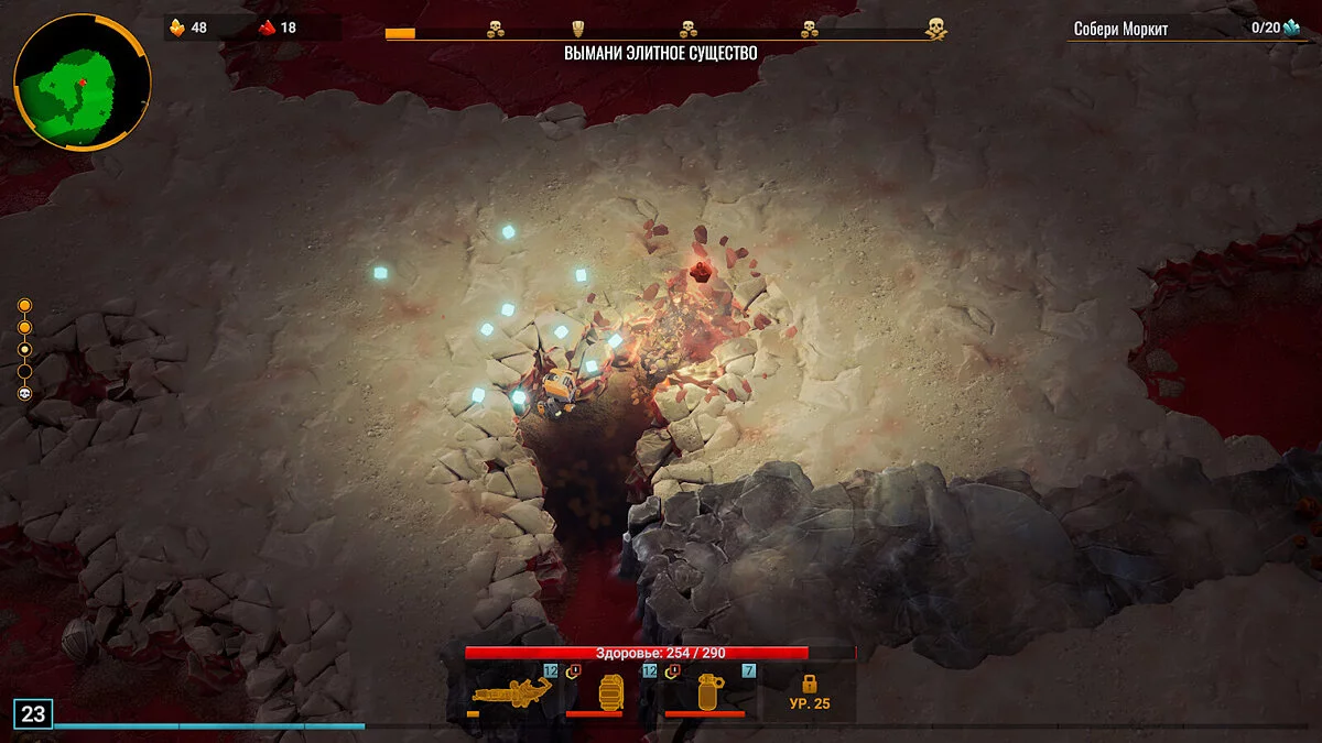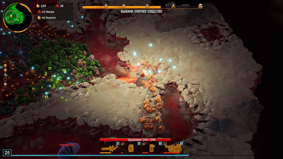В игру добавлен четвёртый биом, который выделяется большими залежами минералов и камней, блокирующих перемещение. Вам потребуются усиления на скорость копания, но здесь можно будет безопасно отбиваться от полчища врагов, пробурив длинный тоннель. В таких условиях можно попробовать новые сборки, а дополнительные золото и нитра ускоряют прокачку оружия. За 1 забег нам удалось собрать по 600 единиц таких ресурсов.