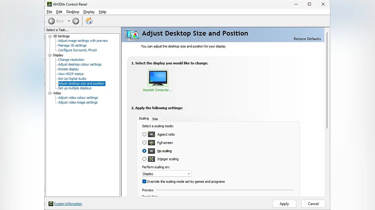 - Установите «Без масштабирования» и убедитесь, что установлен флажок «Переопределить режим масштабирования, установленный играми и программами».
