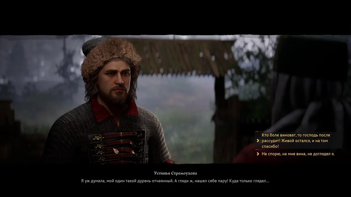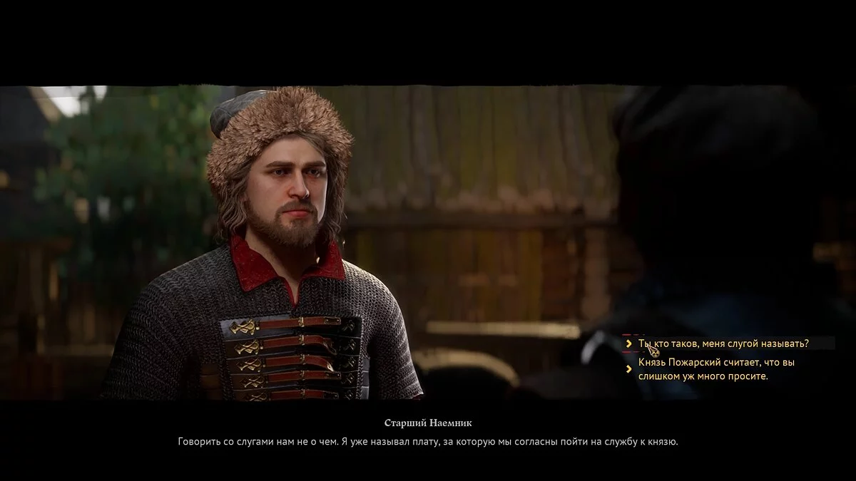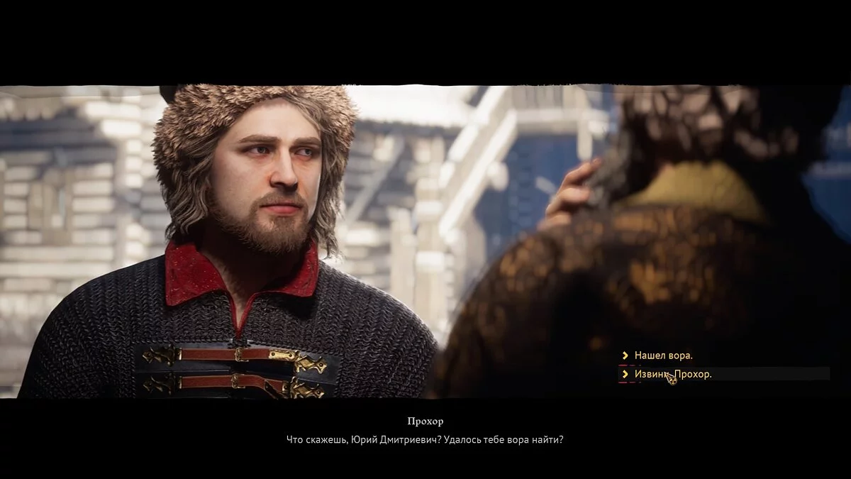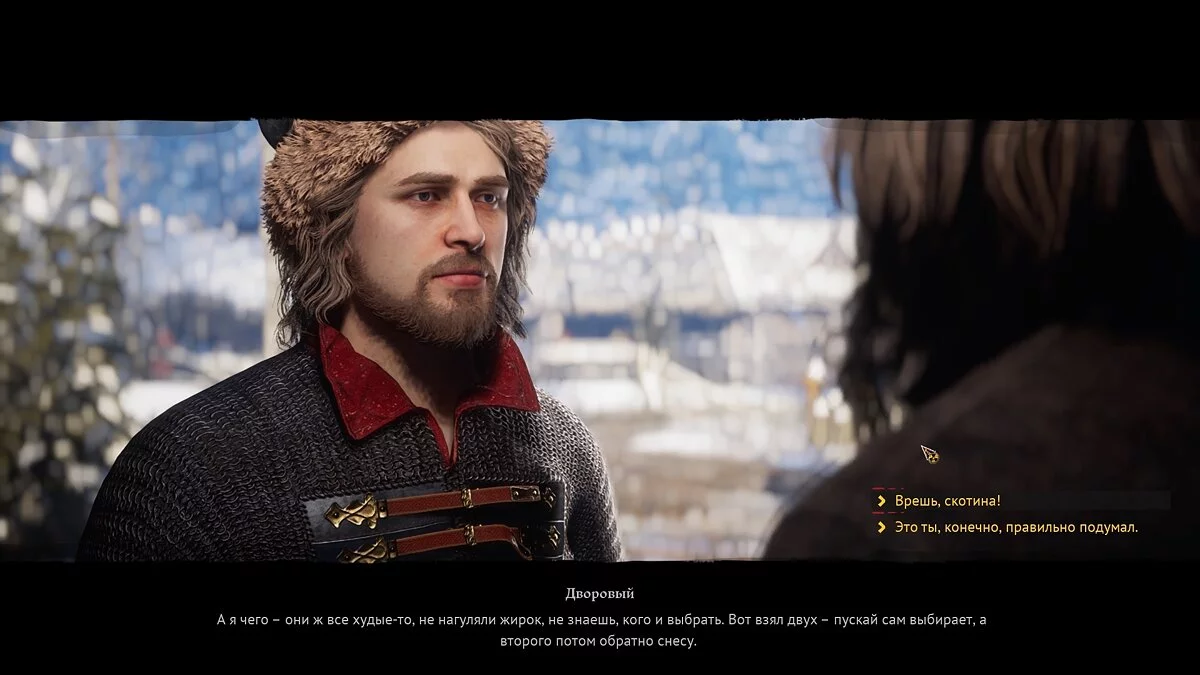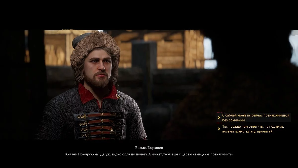 Общаемся с холопом Иваном. На развилке лучше всего выбрать второй вариант «Мы же не про это говорим». Затем говорим с дворовым и выбираем «Это ты, конечно, правильно подумал». Он расскажет про конюха, которого видел недавно в амбаре.