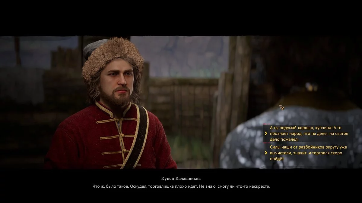 С первым проблем не возникнет — Калашников любезно согласится внести свой вклад. Для этого выберите вариант «Силы наши от разбойников округу уже вычистили, значит, и торговля скоро пойдёт». Но второй купец скажет, что денег у него нет и платить не захочет. Вернитесь к Калашникову и спросите, как можно найти компромат на зажиточного торговца.