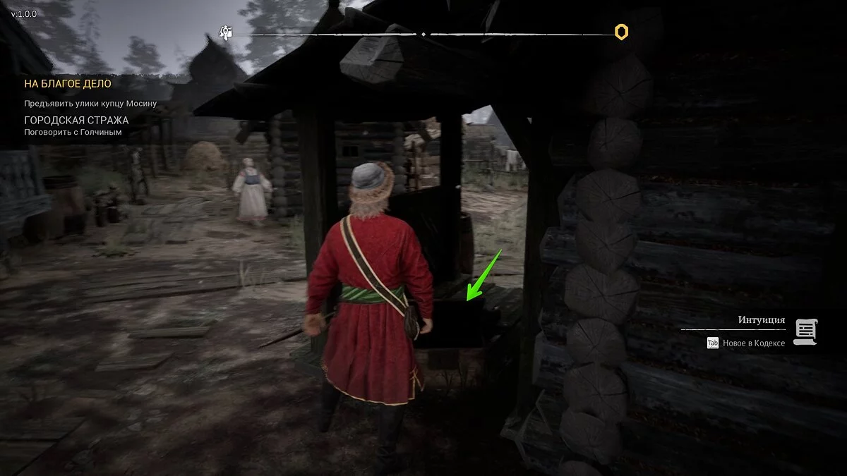 Это задание можно взять у купца Калашникова, с которым вы познакомились ранее. К слову, если вы ещё не исследовали деревню, то можете сделать это сейчас при помощи интуиции. Как только войдёте в посёлок, сверните налево и осмотрите сарай за колодцем. Здесь стоит сундук (Тамга ханская).