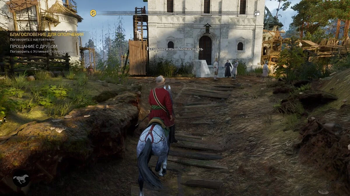 В княжеских покоях беседуем с Мининым и Пожарским, получаем новое задание. Нужно раздобыть древний артефакт, который находится у отшельника. Сперва нужно напасть на его след — для этого поезжайте в разрушенный монастырь и пообщайтесь с настоятелем.